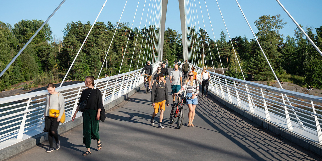 Mehrere Menschen laufen an einem sonnigen Tag über eine Fußgängerbrücke.
