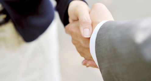Eine Geschäftsfrau und ein Geschäftsmann geben sich die Hand.