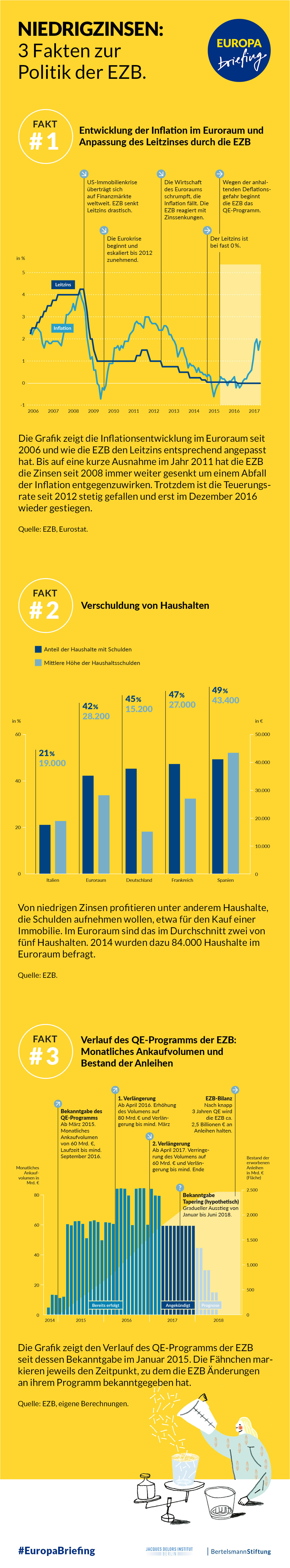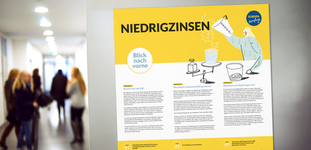 In unserem ersten "Europa Briefing" erklären wir, wann niedrige Zinsen zum Problem werden und was die Europäische Zentralbank (EZB) tut, um die Inflation anzuheben. Außerdem richten wir den Blick nach vorn und schauen, was schlimmstenfalls passieren kann, wenn die Inflation weiter so niedrig bleibt wie bisher. Daneben erläutern wir, was die Regierungen im Euroraum jetzt tun müssen, um die Konflikte um die Niedrigzinspolitik zu lösen.