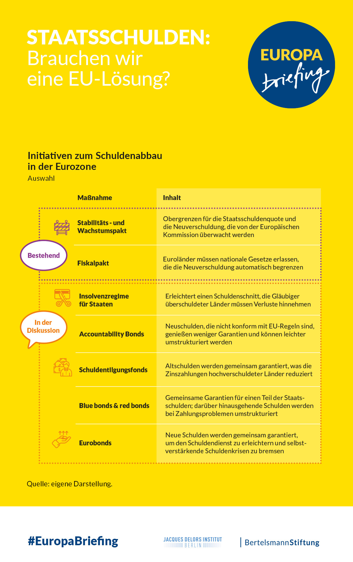 Im Rahmen des Projekts „Repair and Prepare: Strengthen the euro“ erklären wir gemeinsam mit dem Jacques Delors Institut – Berlin in der Publikationsreihe „Europa Briefing“ Schlüsselthemen der Europapolitik und stellen mögliche Szenarien vor: Was ist das Problem? Wie könnte es weitergehen? Und was kann die Politik jetzt tun?