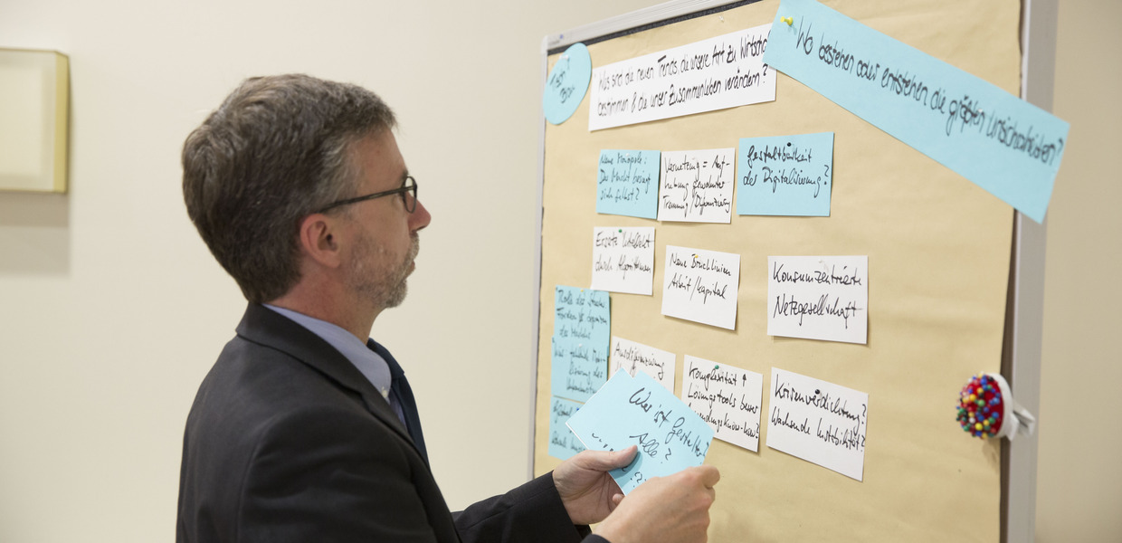 Nach der Begrüßung durch Andreas Esche, Leiter des Programms Nachhaltig Wirtschaften, wurden die Ergebnisse einer Interviewserie vorgestellt, die im Vorfeld der Veranstaltung mit zwölf Wissenschaftlern in Deutschland durchgeführt worden war. Anschließend wurde in Kleingruppen diskutiert: Trends, Unsicherheiten sowie Zielkonflikte künftiger Entwicklungen wurden formuliert und die jeweiligen Chancen und Risiken herausgearbeitet.