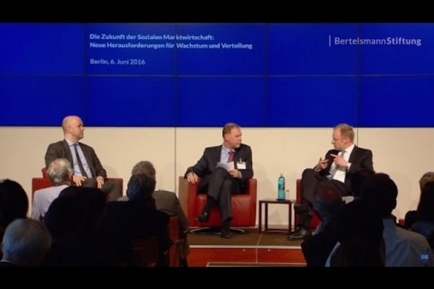 Gerechtigkeitslücken statt „Wohlstand für alle“: Was einst Leitspruch für die Soziale Marktwirtschaft in Deutschland war, ist längst nicht mehr allgemeingültig. Wie fit das bisherige deutsche Erfolgsmodell für die Zukunft ist, diskutierten die Ökonomen Marcel Fratzscher und Clemens Fuest am 6. Juni 2016 in der Bertelsmann Repräsentanz in Berlin. Aart De Geus, Vorstandsvorsitzender der Bertelsmann Stiftung, moderierte die Podiumsdiskussion.