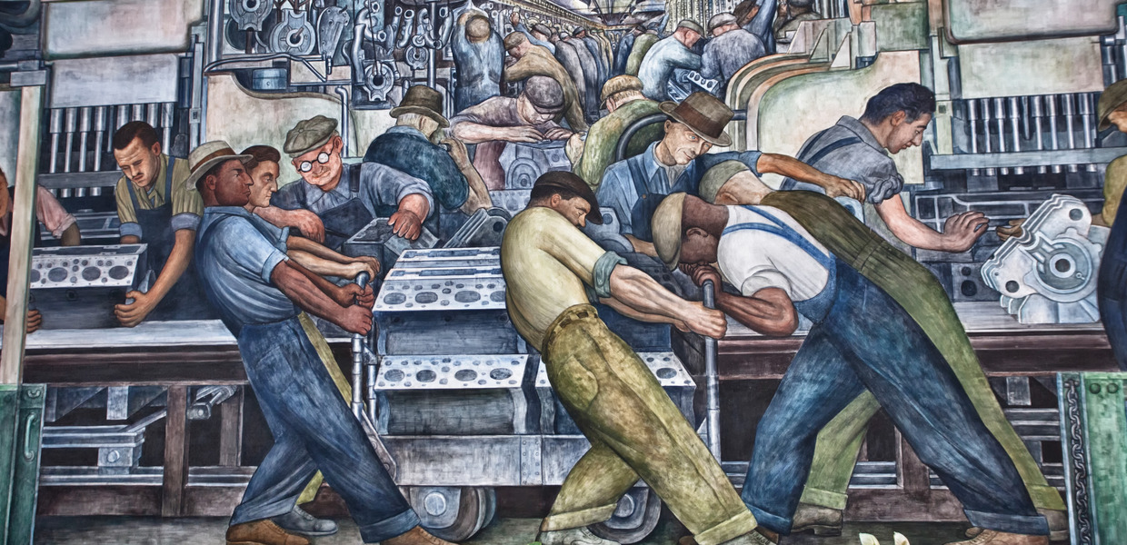 "Gemaltes Bild auf einer Wand in Detroit. Darauf sind Arbeitern bei Ihrer Tätigkeit in einer Autofabrik zu sehen"