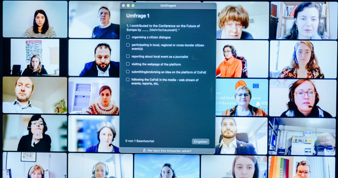 Von den 38 Bürgerdialogen zur Zukunft Europas hatten 57 Prozent einen transnationalen Charakter, entweder mit Bürger:innen aus Partnerstädten, mit Bürger:innen aus Grenzregionen oder mit Bürger:innen aus mehreren Partnerregionen. Vor dem Hintergrund der Covid-Pandemie wurden 75 Prozent der Bürgerdialoge digital oder hybrid durchgeführt, nur 25 Prozent fanden persönlich statt. Am häufigsten diskutierten die Bürger:innen über die Wirtschaft, dicht gefolgt von den Themen Klimawandel, Bildung und Demokratie.