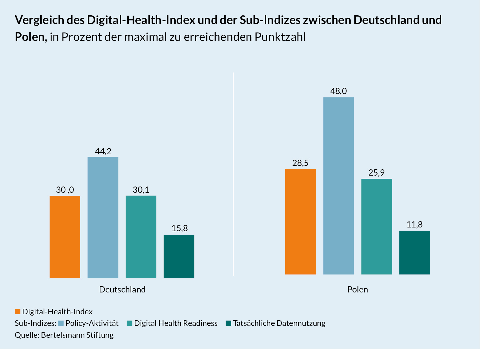 Ob E-Rezept, elektronische Patientenakte, digitaler Datenaustausch, elektronische Medikationsliste oder ein Gesundheitsportal: In Polen ist bisher keine dieser Digital-Health-Lösungen national ausgereift oder implementiert. Zwar haben sich Politik und Versorger auf eine grundsätzliche Digital-Health-Strategie sowie einen konkreten Fahrplan einigen können. Doch insbesondere die mangelnde Finanzierung erschweren unserem Nachbarland eine konsequente Umsetzung: Die meisten Gelder stammen aus EU-Fonds, die mittlerweile jedoch ausgelaufen sind, und die Finanzkrise hatte im Land zu drastischen Sparmaßnahmen der Regierung geführt. Und so belegt Polen Platz 17 im Digital-Health-Ranking, direkt nach Deutschland.
