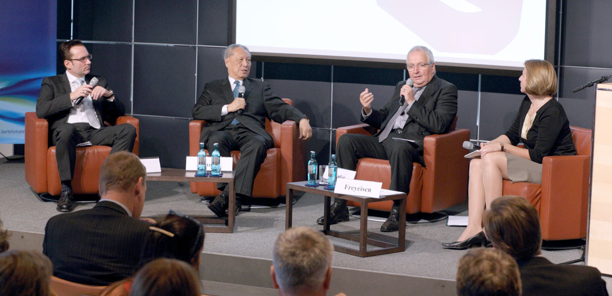 Dr. Olin Liu, Head of the Research-Department of the China International Capital Corpora-tion (CICC), the leading investment bank, Beijing; Dr. Holger Schmieding, Head Economist of the Berenberg Bank, Hamburg; Alexander Graf Lambsdorff, Leader of the Liberal Democratic Party (FDP) in the European Parliament, Brussels; Dirk Heilmann, Head Economist of the Handelsblatt, Düsseldorf (Moderation) - 26. Juni 2012