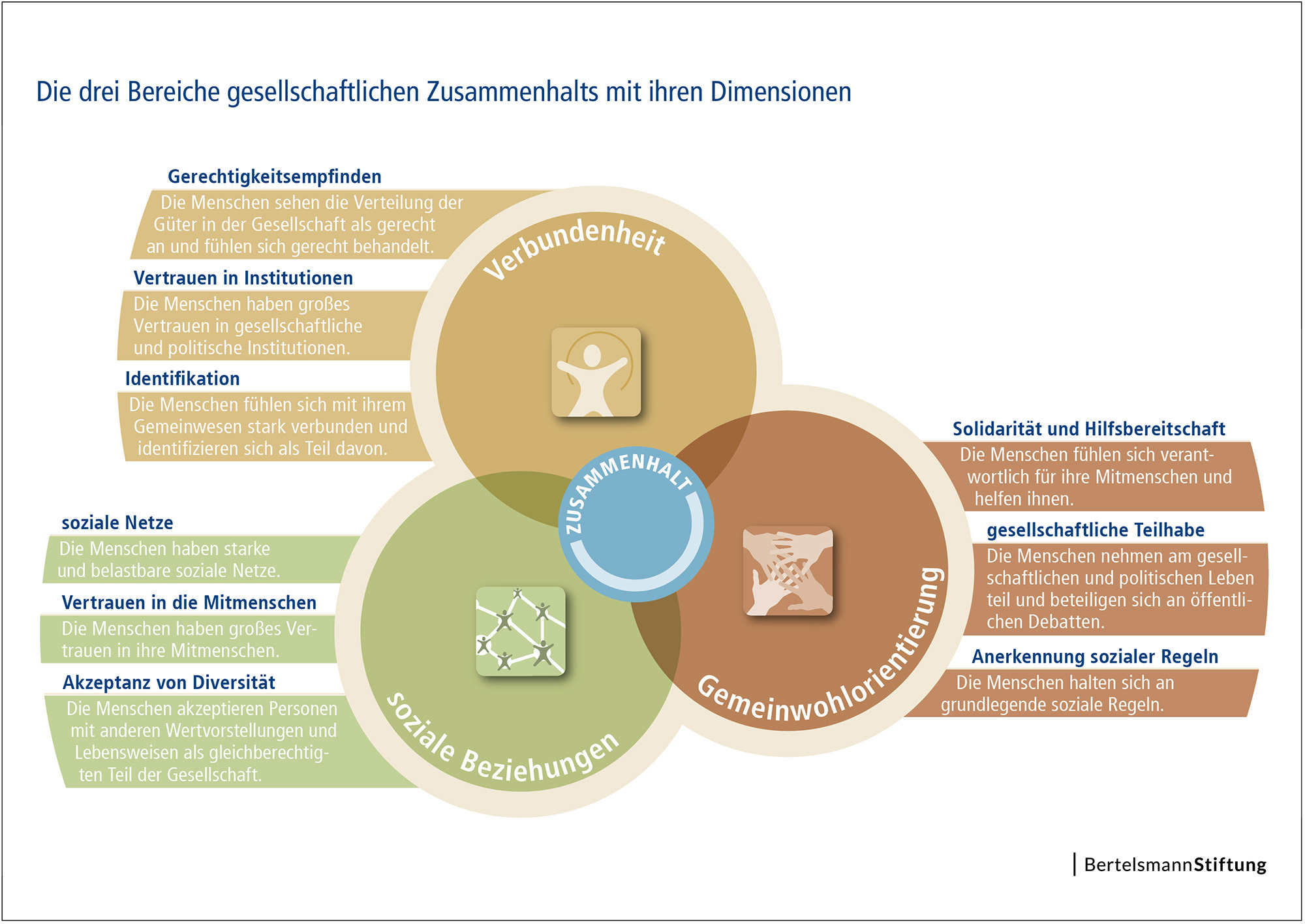 Verbundenheit erzeugt Zusammenhalt durch eine positive Identifikation der Menschen mit dem Gemeinwesen, großes Vertrauen in dessen Institutionen und das Empfinden, dass die gesellschaftlichen Umstände gerecht sind. Deshalb werden hier die Dimensionen Identifikation, Vertrauen in Institutionen und Gerechtigkeitsempfinden erfasst. Gemeinwohlorientierung erzeugt Zusammenhalt durch Handlungen und Haltungen, die Schwache unterstützen, sich an grundlegenden sozialen Regeln orientieren und die gemeinschaftliche Organisation des Gemeinwesens ermöglichen. Ausdruck findet dies in den drei Dimensionen Solidarität und Hilfsbereitschaft, Anerkennung sozialer Regeln und gesellschaftliche Teilhabe in Vereinen und am politischen Geschehen.