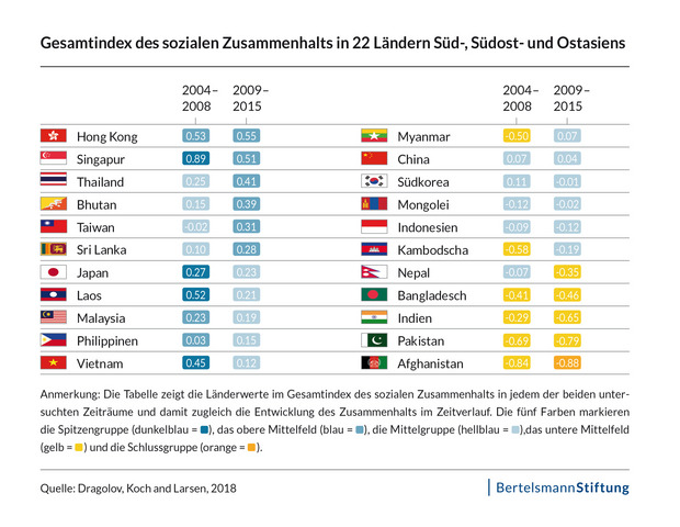 Mit dem Radar gesellschaftlicher Zusammenhalt bieten wir einen empirischen, internationalen Vergleich des sozialen Zusammenhalts in verschiedenen Ländern weltweit. Der Radar basiert auf einer breiten Palette von Indikatoren, die aus vergleichenden internationalen Umfragen und anderen Datenquellen stammen. Die aktuelle Studie umfasst 22 Länder aus Süd-, Südost- und Ostasienmit Daten für die Jahre 2004 bis 2015.