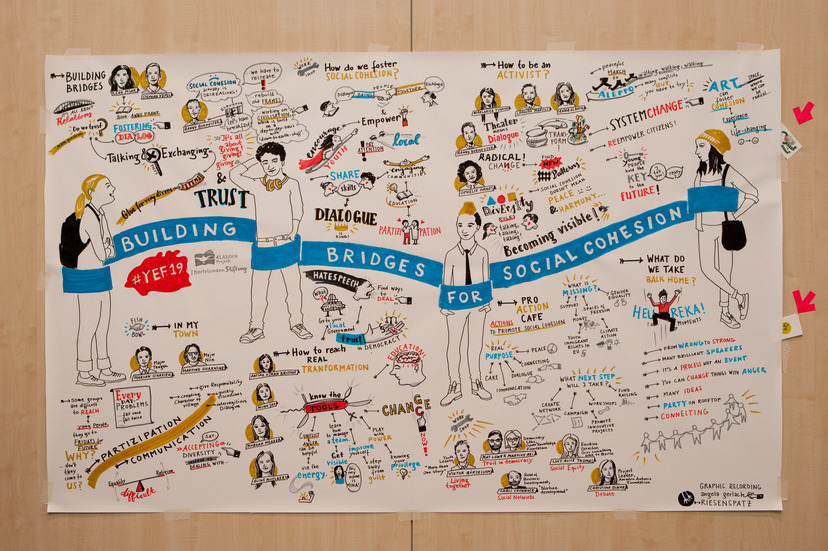 Gesellschaftlicher Zusammenhalt entsteht nicht von allein, sondern muss aktiv gestaltet werden. Wie das gelingt, darüber tauschten sich 100 junge engagierte Erwachsene aus 24 europäischen Ländern auf unserem Young Europeans´ Forum (#YEF19) „Building bridges for social cohesion“ vom 25.-27. Juni in Berlin aus. Die Bertelsmann Stiftung organisierte das #YEF19 gemeinsam mit dem Aladdin Project und in Kooperation mit der UNESCO.