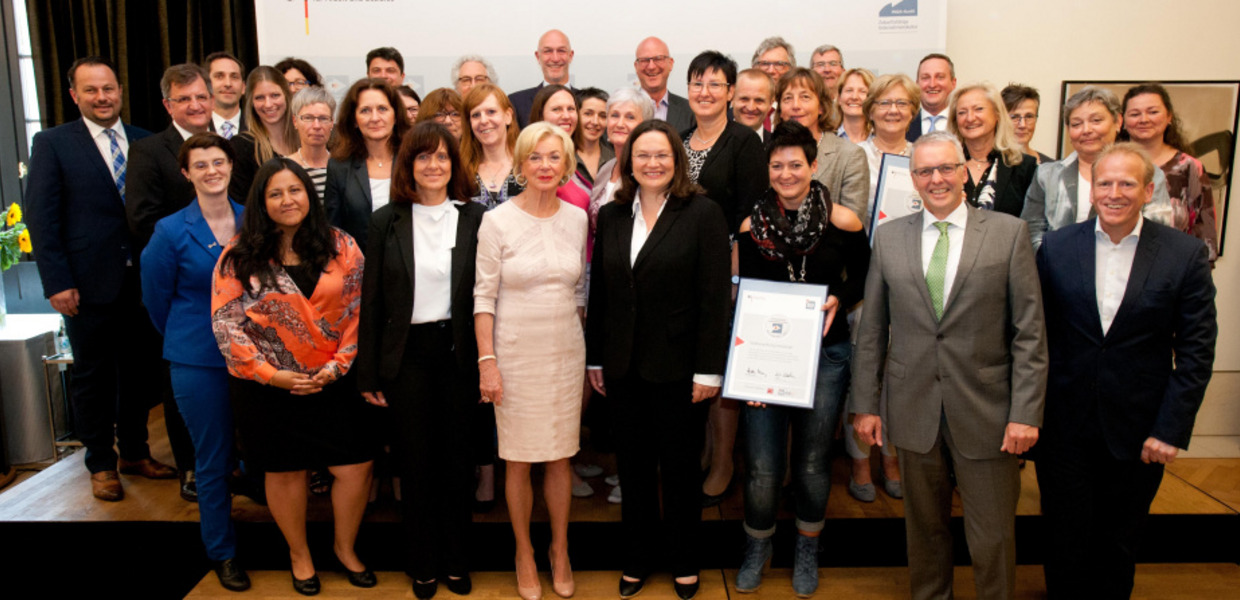 Bundesarbeitsministerin Andrea Nahles (SPD) und Liz Mohn, stellvertretende Vorsitzende der Bertelsmann Stiftung, haben am Dienstag in Berlin 24 Unternehmen, Behörden und Verbände die Audit-Auszeichnung „Zukunftsfähige Unternehmenskultur“ verliehen.