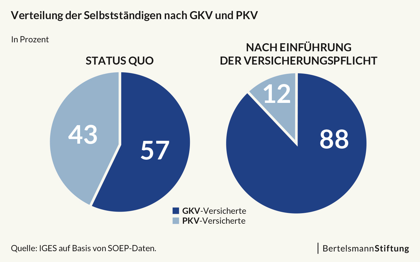 Um allen Selbstständigen in Deutschland einen bezahlbaren Krankenversicherungsschutz zu ermöglichen, spricht sich die Bertelsmann Stiftung für die Ausweitung der für Arbeitnehmer geltenden Krankenversicherungspflicht aus. Zudem schlägt sie die Absenkung oder Abschaffung des Mindestbeitrages für Selbstständige vor. Einer im Auftrag der Stiftung erstellten Studie zufolge würden diese Maßnahmen nicht zu einer wesentlichen Mehrbelastung für die gesetzliche Krankenversicherung führen.