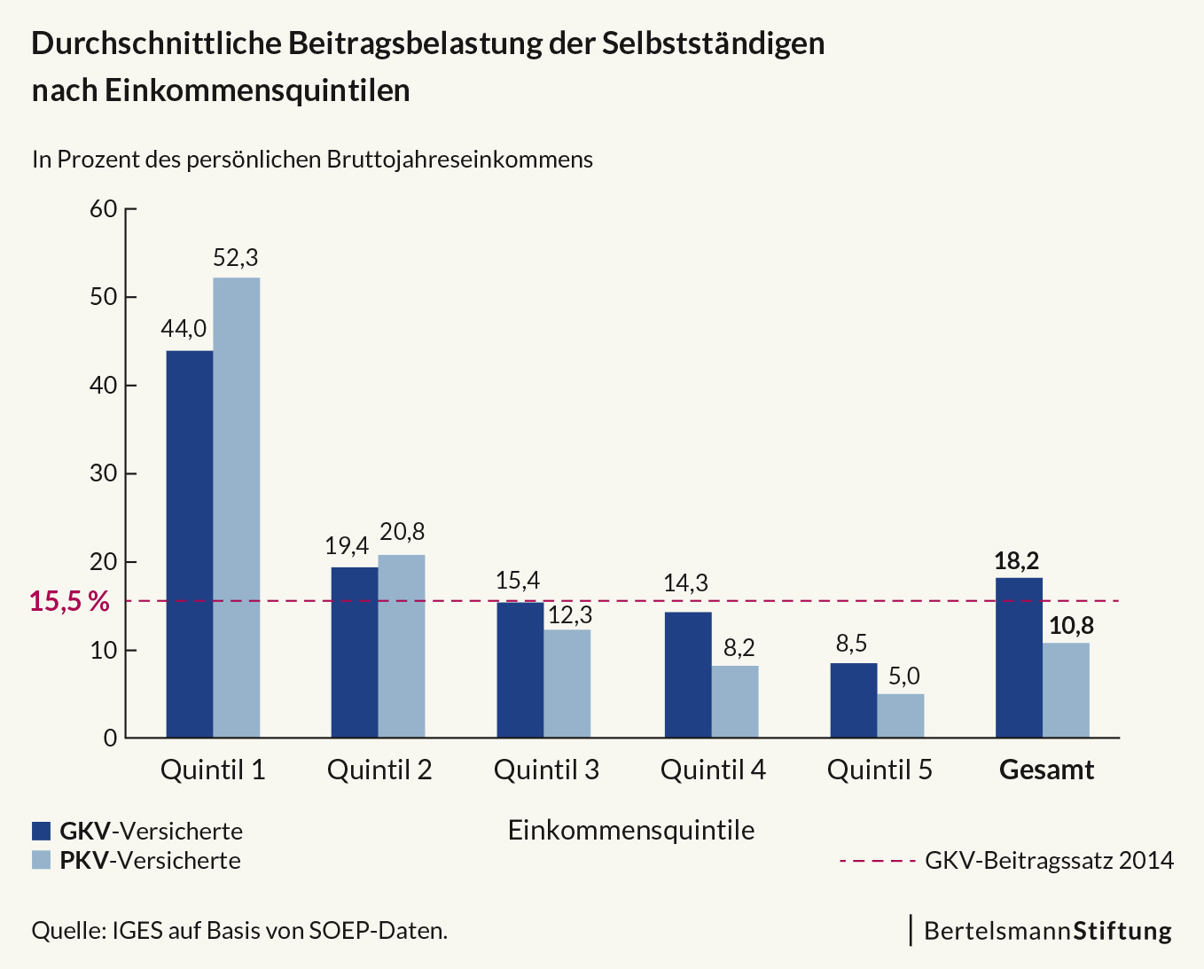 Der so genannte Mindestbeitrag in der GKV [s. Kasten] führt viele Selbstständige an die Grenzen ihrer finanziellen Leistungsfähigkeit. Die Folge sind u. a. stetig steigende Beitragsschulden in der GKV, die – wie jüngst berichtet – vor allem durch Soloselbständige mit geringen Einkünften verursacht werden. Die Studie der Bertelsmann Stiftung zeigt, dass das untere Einkommensfünftel der Selbstständigen nach eigenen Angaben knapp die Hälfte seiner Einnahmen für den Krankenversicherungsbeitrag ausgibt. Häufig springen hier Familienangehörige mit ein.