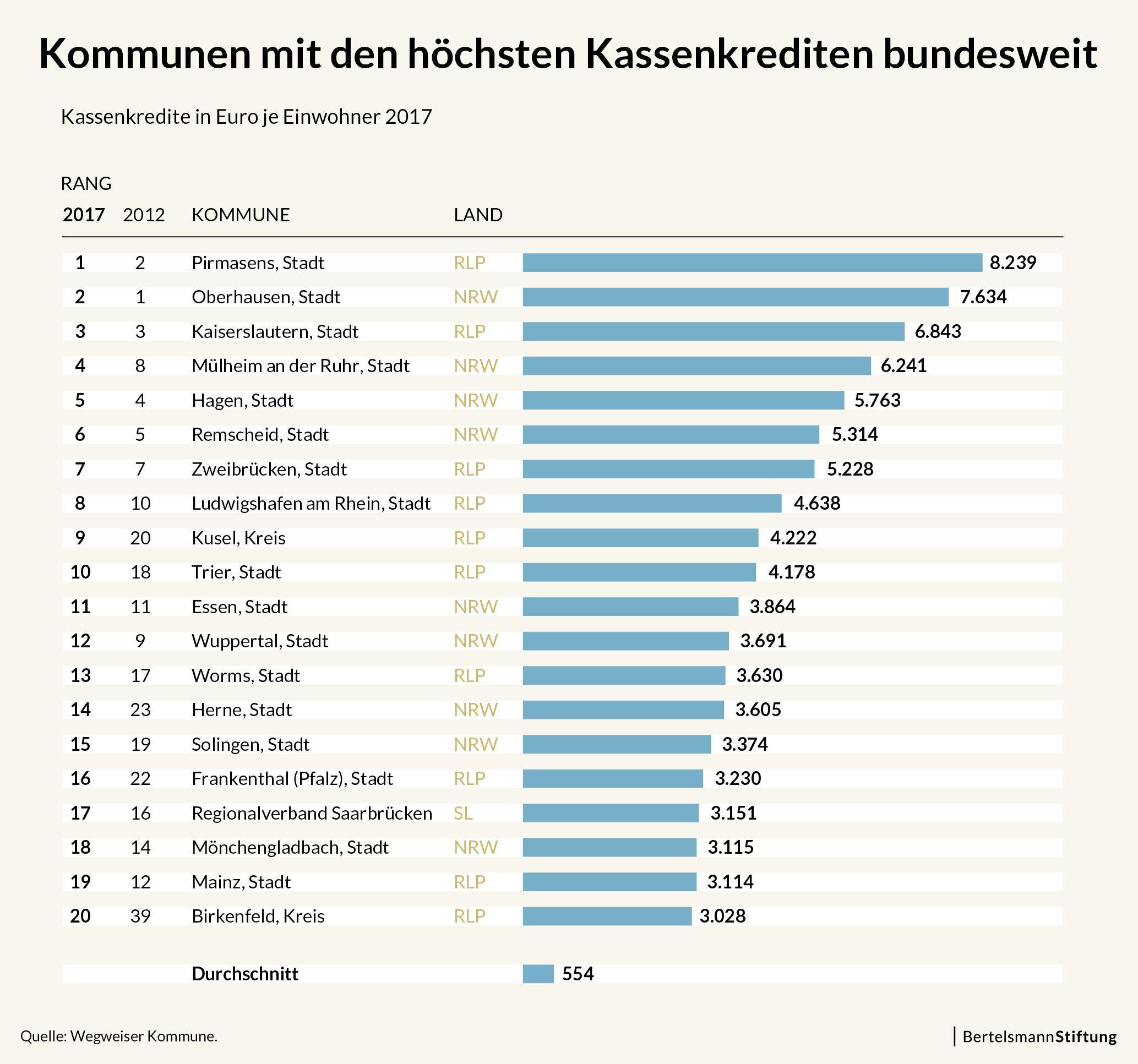 Von den 20 Kommunen mit den höchsten Kassenkrediten 2017 liegen 19 in Rheinland-Pfalz und NRW. 17 sind kreisfreie Städte. Acht der zehn höchstverschuldeten Kommunen gehörten bereits 2012 zu dieser Gruppe. Rund die Hälfte der bundesdeutschen Kommunen ist hingegen nahezu frei von Kassenkrediten. Interessant ist auch der Vergleich zu den Steuereinnahmen der Kommunen: In 34 Kommunen belaufen sich die Kassenkredite auf mindestens das Doppelte der jährlichen Steuereinnahmen. Im Vergleich zum Jahr 2012 zeigt sich jedoch in fast allen Kommunen eine Entspannung, da die Steuereinnahmen deutlich stiegen.