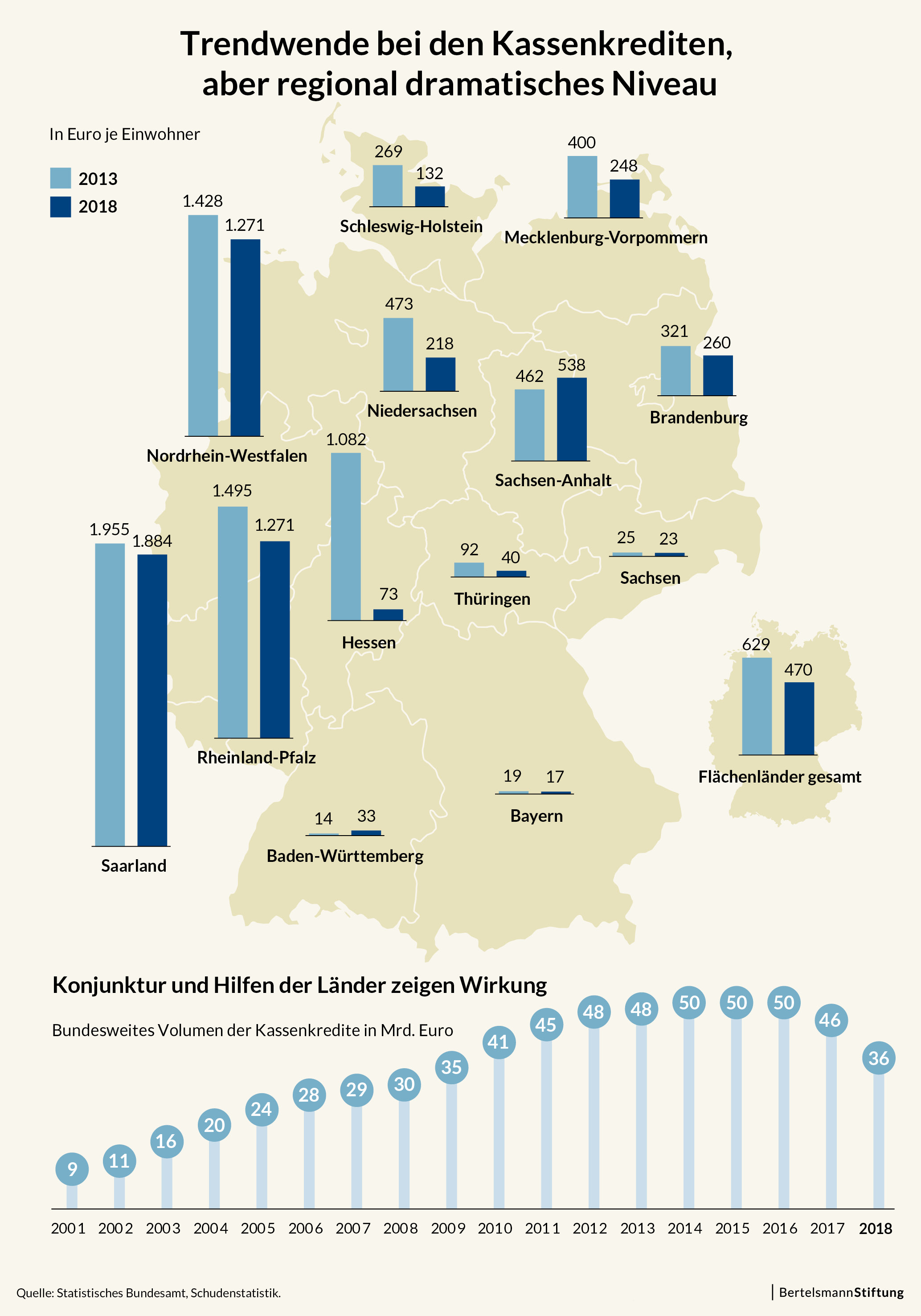 Mit Blick auf die 397 Kreise und kreisfreien Städte werden unterschiedliche Muster deutlich. Allgemein ist die Belastung der kreisfreien Städte höher, unter anderem in Folge der höheren Soziallasten. Die Kommunen in Süddeutschland sind flächendeckend nahezu schuldenfrei. In Sachsen und Thüringen existiert jeweils nur eine Kommune mit höheren Kassenkrediten. In den drei weiteren ostdeutschen Ländern finden sich einige langjährige Krisenfälle und gänzlich schuldenfreie Kommunen sind selten. Niedersachsen ist ein Land mit hoher interner Varianz und örtlich nah beieinanderliegenden krisenhaften und gesunden Kommunen. In Schleswig-Holstein konzentrieren sich die Probleme auf die kreisfreien Städte, ohne allerdings sehr hohe Werte zu erreichen. In den drei Ländern, in denen die kommunalen Kassenkredite ein weit überdurchschnittliches Niveau aufweisen, betrifft die Krise weite Teile der Kommunen.