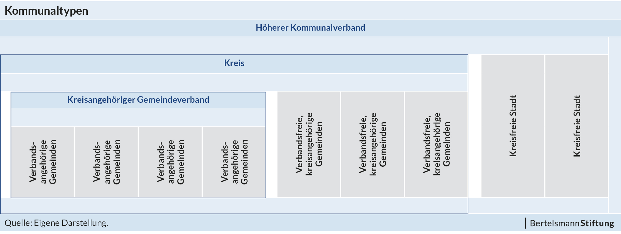 Obgleich landläufig meist von „der Kommune“ gesprochen wird, verbergen sich hinter diesem Begriff bis zu sechs Kommunaltypen. Die Verteilung dieser Kommunaltypen variiert zwischen den Ländern; ebenso deren Einwohnerzahl und Verwaltungskraft. Kommunale Struktur und der Aufgabenkatalog stehen im Ermessen der Landesgesetzgeber. Aufgaben und Ausgabenbelastung sind damit zwischen den Ländern oft nicht eindeutig zu vergleichen.