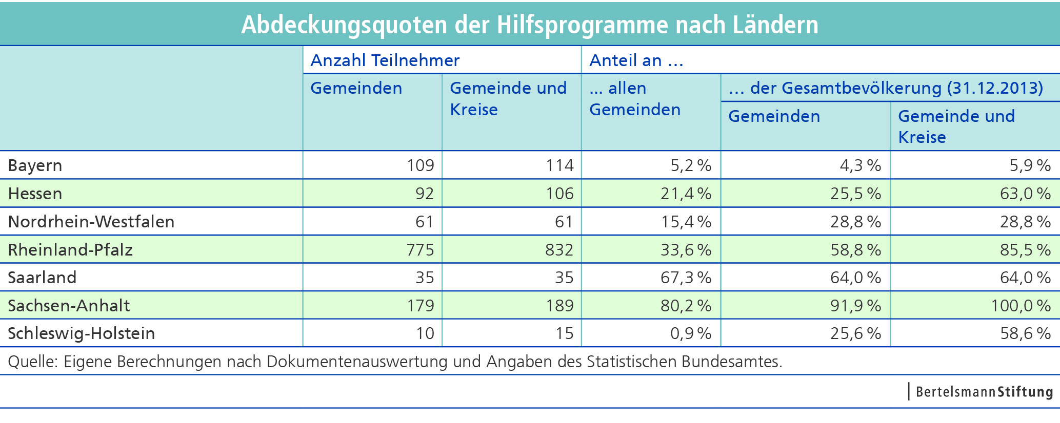 Die teilweise desolate Lage der kommunalen Haushalte hat in den letzten Jahren neuen Strategien auf Seiten der Länder geführt. Mittlerweile neun der 13 Bundesländer haben besondere Programme zur Entschuldung oder Stabilisierung ihrer Kommunen aufgelegt. Diese Programme existieren außerhalb des regulären Finanzausgleichs. Ein neuer Finanzierungskanal wurde geschaffen. Die Ausgestaltung der Programme birgt eine enorme Vielfalt; z. B. hinsichtlich der Teilnahmevoraussetzungen, der Bedingungen, Laufzeiten, Volumina.