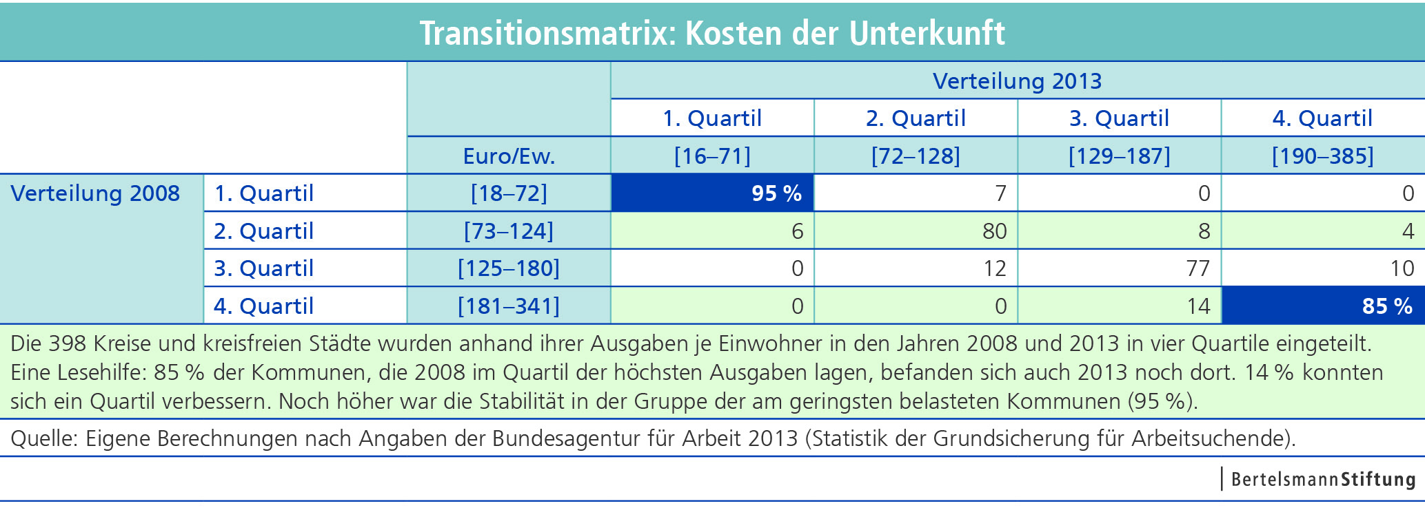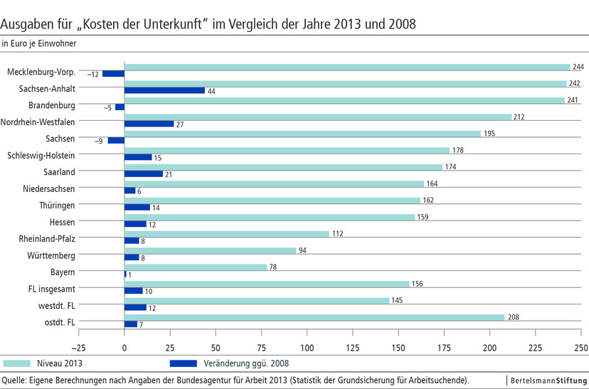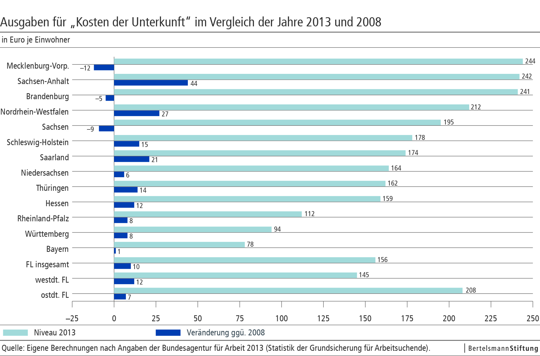Aber auch innerhalb der Bundesländer können beachtliche Differenzen auftreten. Am größten sind sie in Nordrhein-Westfalen und Hessen; am geringsten in Ostdeutschland. Dies lässt sich leicht erklären: In NRW und Hessen gibt es starke und schwache Kommunen. Dies bewirkt eine große Spannweite der Belastung aus den Hartz-IV-Wohnkosten. In Ostdeutschland sind die Ausgaben in allen Kommunen hoch.