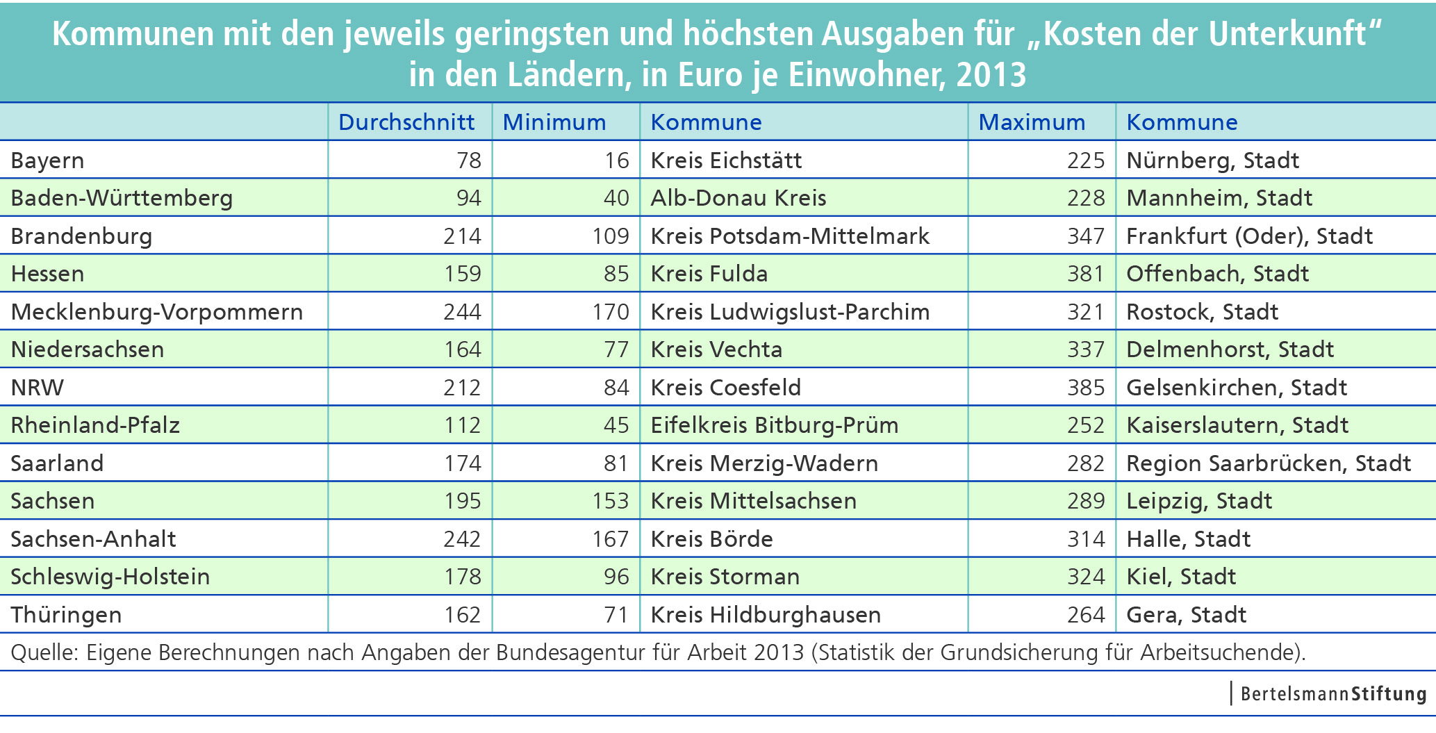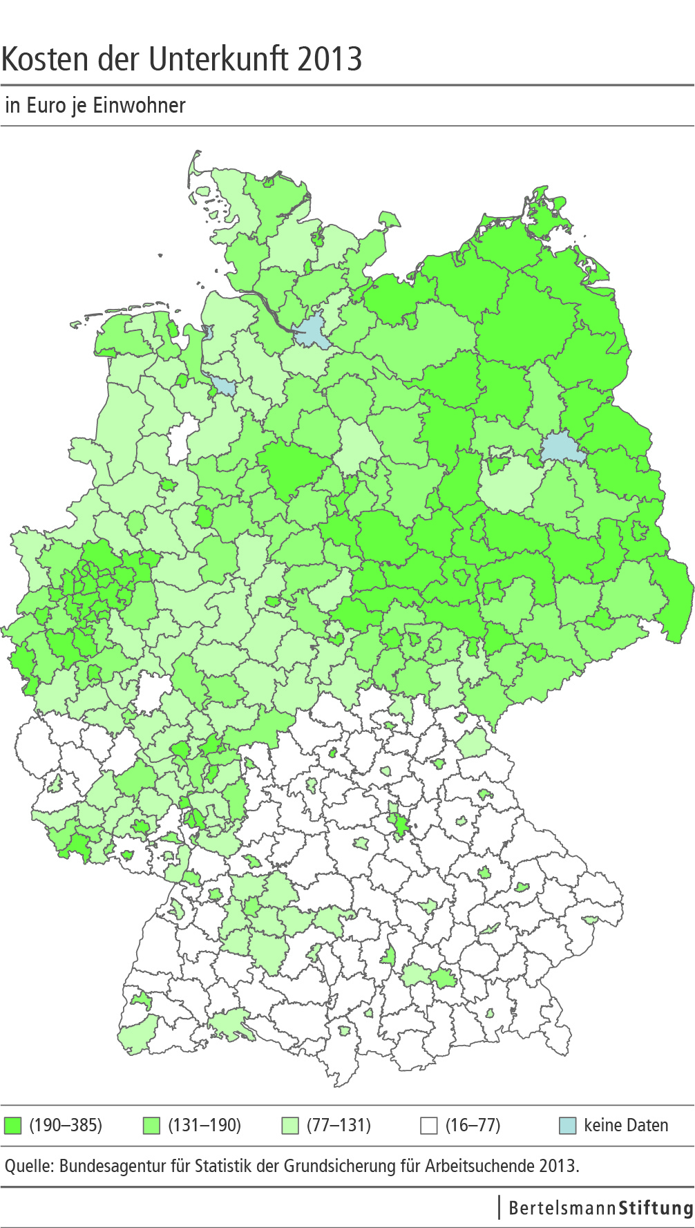 Bundesweit treten zwischen den 398 Kreisen und kreisfreien Städte enorme Differenzen aus den Hartz-IV-Wohnkosten auf. Die Ausgaben je Einwohner bewegen sich zwischen 16 Euro im bayerischen Kreis Eichstätt und 388 Euro in der Stadt Offenbach. Der Faktor beträgt 1 zu 24. Die 28 Kommunen mit der geringsten Belastung liegen allesamt in Bayern.