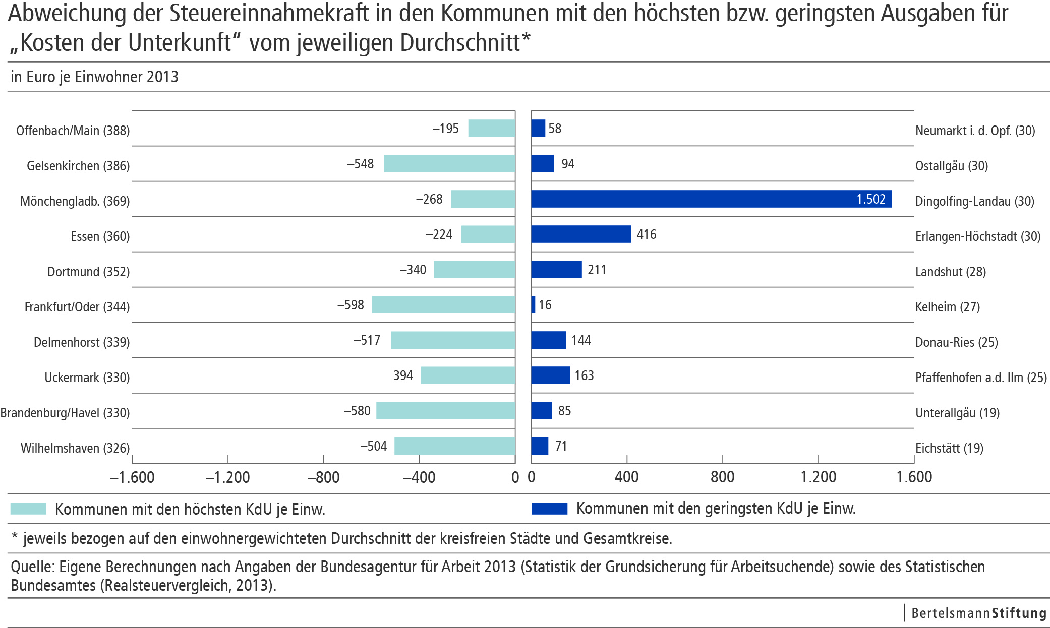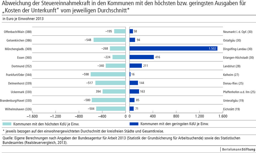 Erschwerend kommt hinzu, dass ein negativer Zusammenhang der Hartz-IV-Wohnkosten zu den Steuereinnahmen und Investitionen besteht. Die zehn höchst belasteten Kommunen liegen weit unter dem Durchschnitt der Steuerkraft, die zehn am geringsten belasteten Kommunen darüber. Ausgaben für soziale Leistungen verdrängen Jahr für Jahr Investitionen in die Zukunft. Hohe Ausgaben für die Hartz-IV-Wohnkosten spiegeln sich in einem Verfall der Infrastruktur wider. Hohe Sozialausgaben gehen in einigen Regionen ebenso mit hohen Defiziten und Kassenkrediten einher.