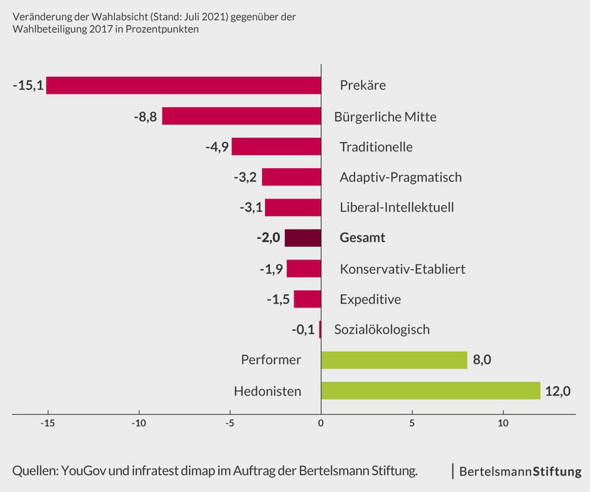 Die 2017 leicht rückläufige Spaltung könnte sich deshalb bei der Bundestagswahl 2021 wieder vertiefen, wenn der populistische Einmaleffekt verpufft, weil die enttäuschten Protestwähler:innen aus den sozial prekären Milieus wieder in die Wahlverweigerung gehen. Genau das lassen die aktuellen Umfragedaten zur Wahlbereitschaft dieser Milieus vermuten. Und pandemiebedingt zeigen sich derzeit auch die anderen Milieus noch etwas wahlmüde. Das könnte sich zu einem „Corona-Effekt" verdichten, der die Wahlbeteiligung bei der Bundestagswahl 2021 spürbar verringert und ihre soziale Spaltung wieder vertieft.