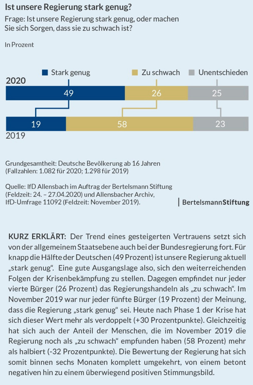 Laut einer Allensbach-Umfrage im Auftrag der Bertelsmann Stiftung hält knapp die Hälfte der Deutschen (49 Prozent) die Regierung derzeit für „stark genug“. Dagegen empfindet nur jeder vierte Bürger (26 Prozent) das Regierungshandeln als „zu schwach“. Innerhalb von sechs Monaten hat sich somit das Stimmungsbild zur Bundesregierung massiv gewandelt: Im November 2019 war nur jeder fünfte Bürger (19 Prozent), der Meinung, dass die Regierung „stark genug“ sei. Heute nach Phase 1 der Krise hat sich dieser Wert mehr als verdoppelt (+30 Prozentpunkte). Gleichzeitig hat sich auch der Anteil der Menschen, die im November 2019 die Regierung noch als „zu schwach“ empfunden haben (58 Prozent), mehr als halbiert (-32 Prozentpunkte). Die Bewertung der Regierung hat sich somit binnen sechs Monaten komplett umgekehrt, von einem betont negativen zu einem überwiegend positiven Stimmungsbild. Seit Allensbach die Frage im Jahr 1999 erstmals gestellt hat, war die Stimmung noch nie so gut.