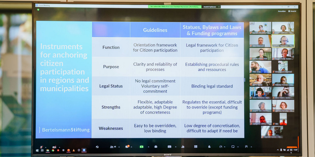 Warum ist Bürgerbeteiligung wichtig und warum braucht es dazu einen institutionellen Rahmen? Europaweit stieß das Thema unserer Veranstaltung auf großes Interesse: mehr als 120 angemeldete Teilnehmer:innen aus 27 Ländern und 70 Regionen, Städten und Gemeinden waren bei Veranstaltung der Initiative „A new chapter for participatory democracy“ der Bertelsmann Stiftung und des Europäischen Ausschusses der Regionen dabei.