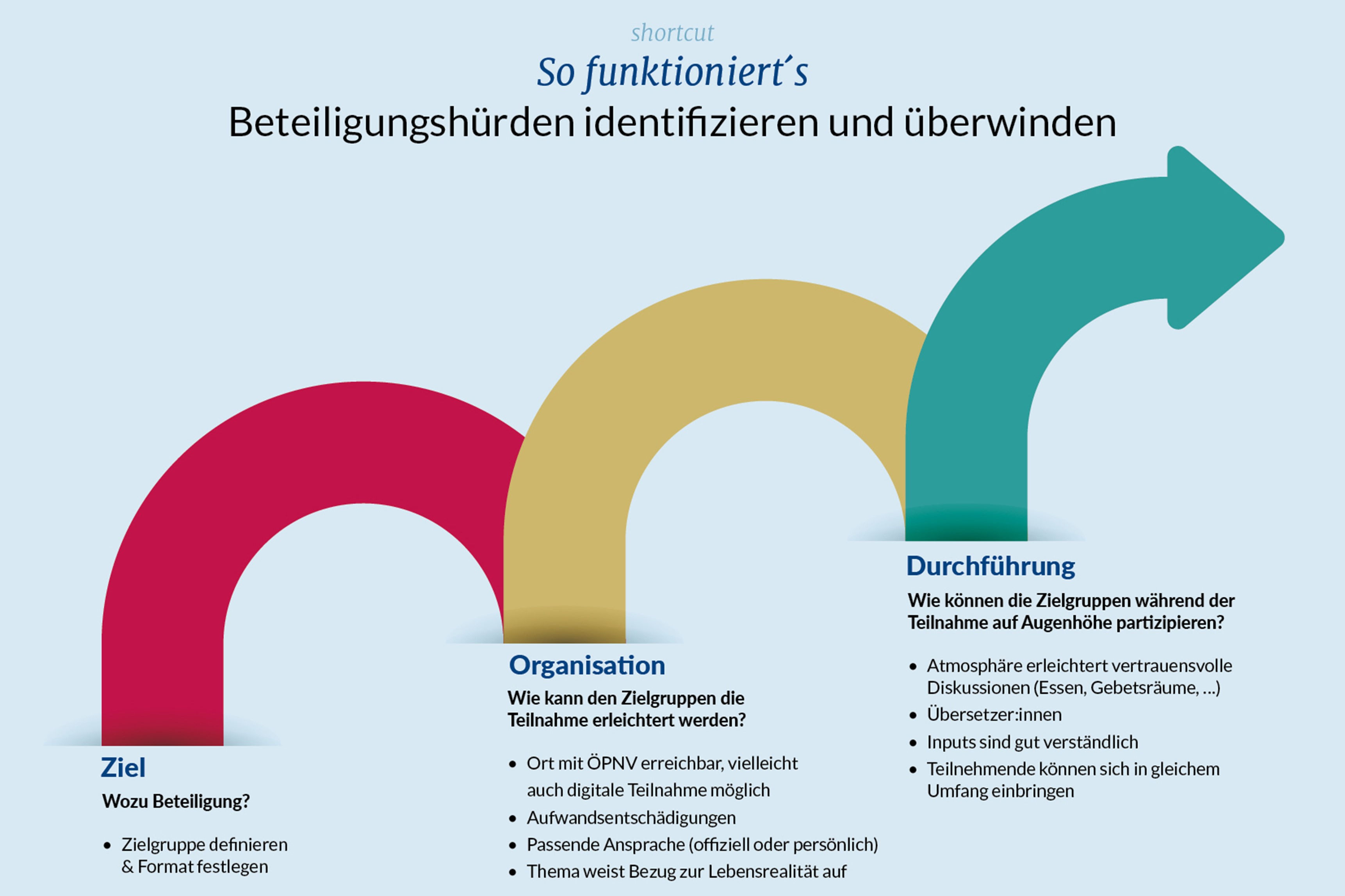 Wie kann vielfältige Beteiligung gelingen? Drei Aspekte sind wichtig: Erstens die Frage, welchen Zweck das Beteiligungsverfahren verfolgen soll. Abhängig davon werden Zielgruppe und Format der Beteiligung festgelegt. Bestimmte Gruppen können in einem geschützten Raum einbezogen werden, etwa, wenn es um Erfahrungen mit Diskriminierung geht. Einige Themen betreffen vor allem eine bestimmte Gruppe, wie beispielsweise Projekte zur Stadtentwicklung. Bei anderen Themen ist es gut, wenn möglichst viele unterschiedliche Menschen mitreden – zum Beispiel in einem Bürgerrat. Zweitens sollten Beteiligungshürden identifiziert und überwunden werden. Insbesondere Menschen aus Gruppen, die sich im Regelfall nicht oder nur selten in Beteiligungsprozesse einbringen, sind oft durch äußere Umstände daran gehindert. Drittens spielen auch mangelndes Vertrauen oder fehlende Selbstwirksamkeit bei der Nicht-Beteiligung vieler Menschen eine Rolle. Beteiligung ist für die meisten nicht selbstverständlich – hier können Organisator:innen im Planungsprozess ansetzen, um Beteiligung vielfältiger zu gestalten.