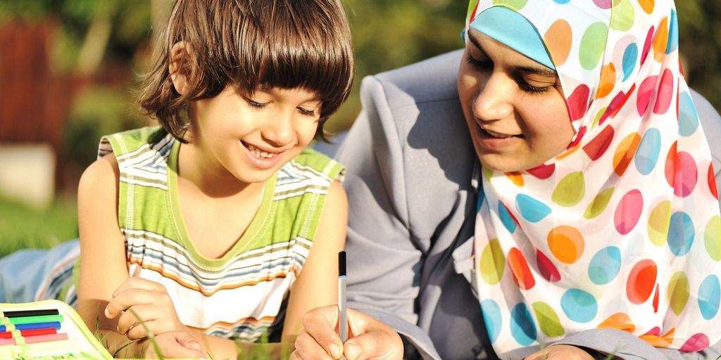 Muslimische Mutter und Kind liegen auf einer Wiese