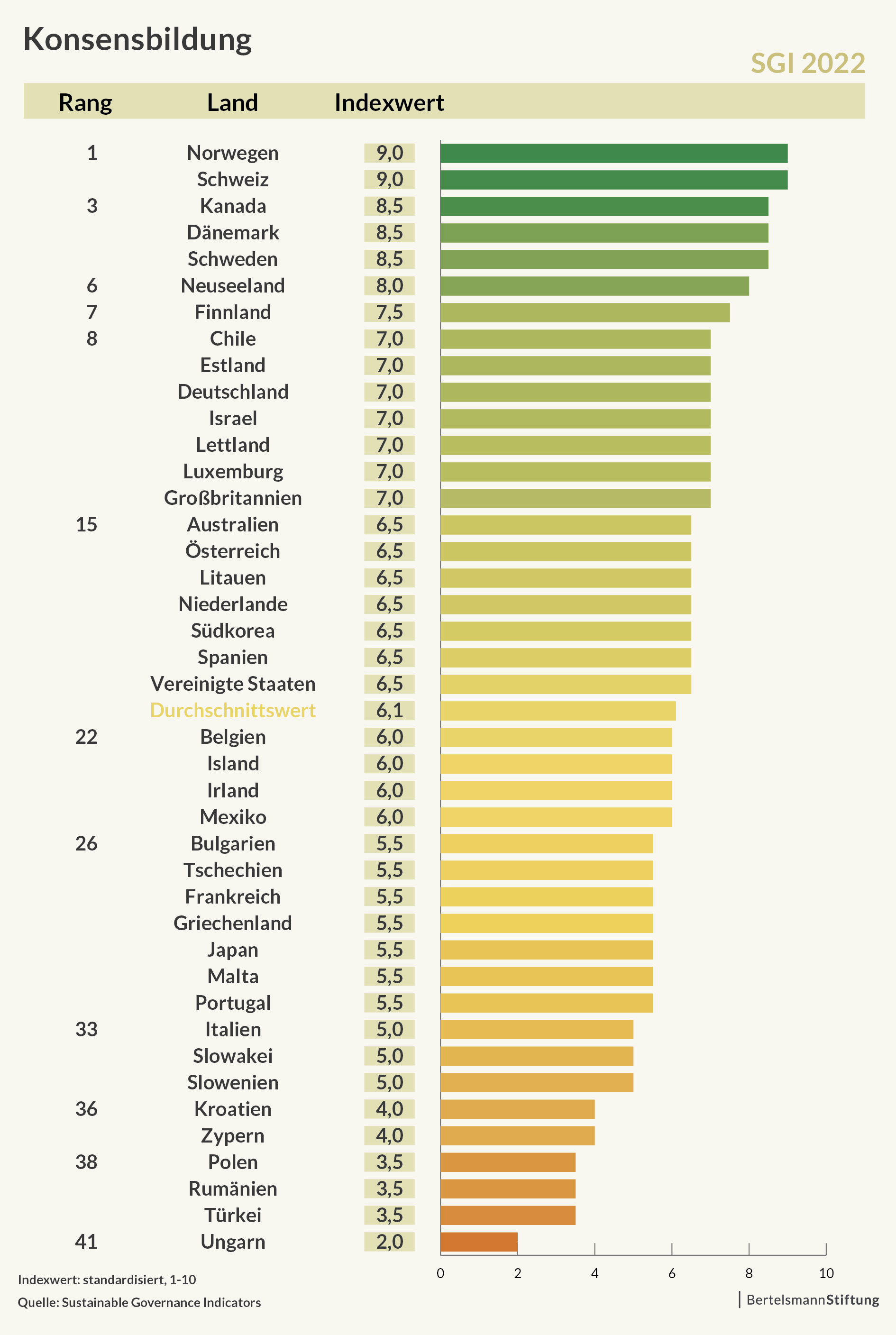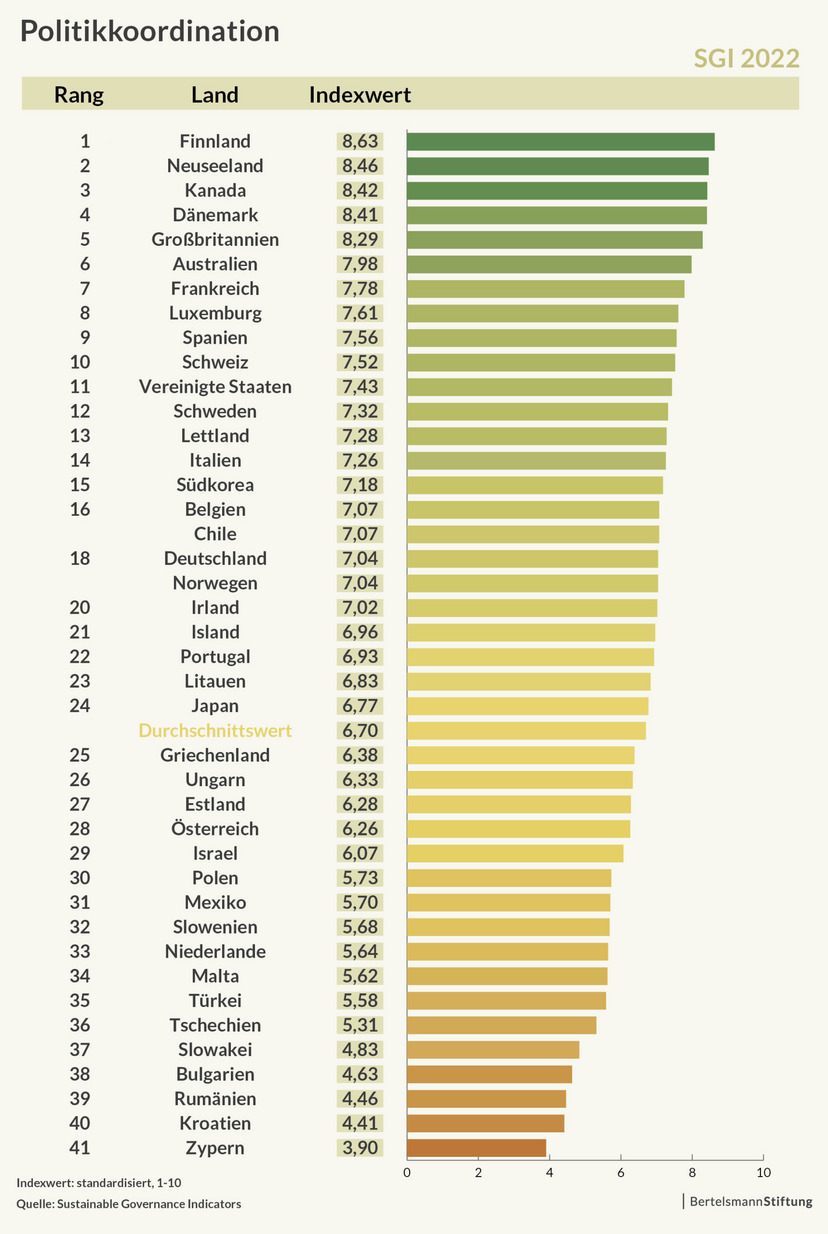 Trotz einer positiven Entwicklung am Beginn der Corona-Pandemie, gibt es weiterhin beträchtlichen Verbesserungsbedarf bei der vorausschauenden Politikkoordination, der Schaffung eines breiten gesellschaftlichen Konsenses sowie bei der Strategieentwicklung in den OECD- und EU-Staaten. Noch zu wenige Staaten machen vor, dass hier zukunftstaugliche Lösungen möglich sind. "Neben der Stärkung demokratischer Institutionen und Prozesse kommt es darauf an, eine neue Art des Regierens zu etablieren: proaktiv über Silos hinweg, demütig und offen für die breite Einbeziehung neuen Wissens und relevanter gesellschaftlicher Akteure sowie strategisch als Kultur des fortlaufenden Lernens und Ausprobierens", kommentiert Christof Schiller, Studienautor und Governance-Experte der Bertelsmann Stiftung. Das sind die Ergebnisse einer Studie zur jüngsten Auswertung der Sustainable Governance Indicators. Mit dem internationalen Monitor erfasst die Bertelsmann Stiftung seit mehr als zehn Jahren Fortschritte der OECD- und EU-Staaten in der Qualität des vorausschauenden Regierens.
