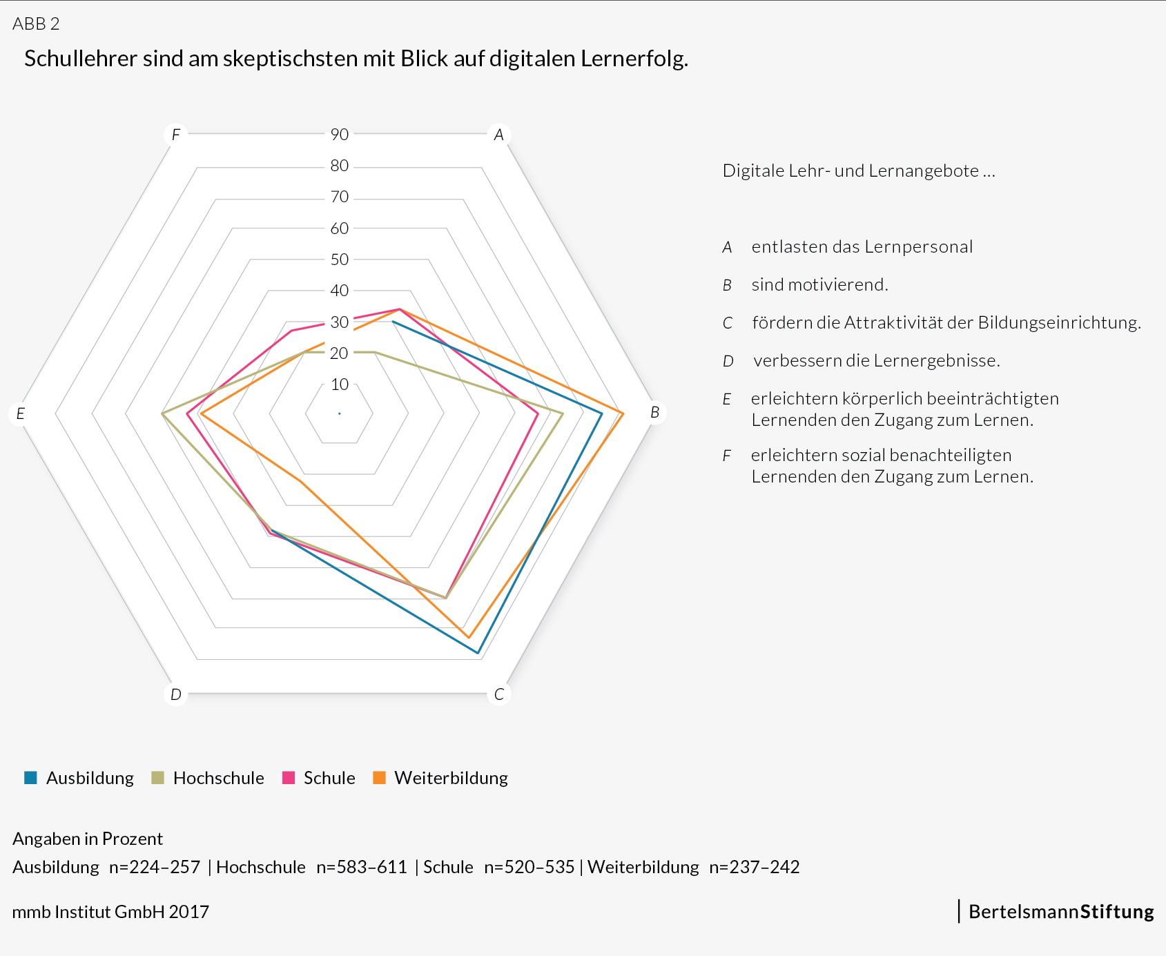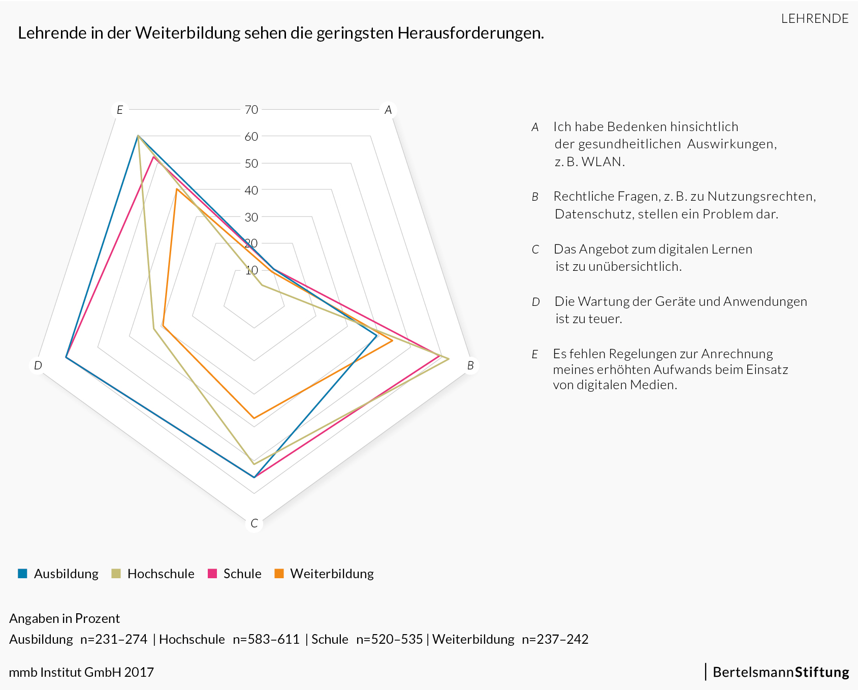 Sieht man sich die Antworten der Lehrenden in allen Bildungssektoren genauer an, so fällt auf, dass die wahrgenommenen Herauforderungen in Bezug auf digitales Lernen in jedem Sektor unterschiedlich sind. In den Sektoren Schule und Ausbildung spielen die Kosten eine höhere Rolle als in der Hochschule und in der Weiterbildung. Bei Schule aber auch in der Weiterbildung ist die Robustheit bzw. die Zuverlässigkeit der Geräte ein ausschlaggebendes Kriterium. Gerade dort wo der Pluralismus von Lerninhalten eine große Rolle spielt (Hochschule und Weiterbildung), stellen rechtlichen Fragen ein großes Problem dar. Sowohl in der Ausbildung, in der Weiterbildung als auch an Hochschulen wird bemängelt, dass der erhöhte Aufwand durch digitale Medien als Arbeitsleistung nicht angerechnet wird. Lehrende aus den Sektoren Schule und Weiterbildung bemängeln die fehlende professionelle Betreuung der digitalen Infrastruktur.