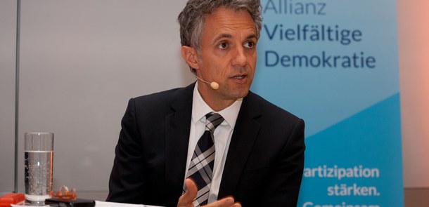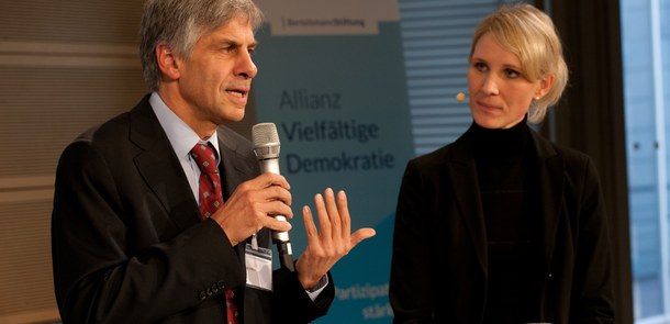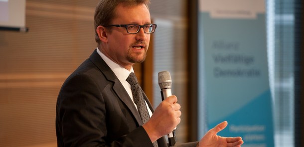Aus eigener Erfahrung verdeutlichte Michael Sack, wie Bürgerbeteiligung helfen kann, dem demographischen Wandel in einer stark betroffenen Region zu begegnen. Der „heilsame Schock“ einer erschreckend negativen Bevölkerungsprognose habe geholfen, eine Gegenbewegung einzuleiten. Politik, Verwaltung und Bürger haben einen intensiven Dialog über die Zukunft in ihrer Stadt begonnen. Nach den ersten Erfolgen wurde klar: „Wir können etwas bewegen, wenn wir auch wollen.“ Doch seien dem Bürgersinn durch viele Gesetze des Bundes und des Landes auch Grenzen gesetzt. Politik und Verwaltung müssten hier lernen, umzudenken: „Schafft Experimentierräume, damit wir sehen, ob neue Ideen auch funktionieren!“
