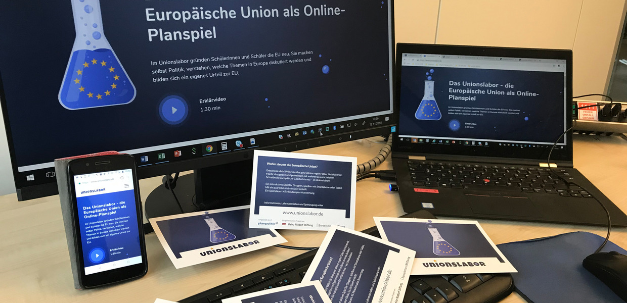 Das ‘Unionslabor’ wurde Ende 2018 in Kooperation mit der Heinz Nixdorf Stiftung und dem Berliner Unternehmen planpolitik von der Bertelsmann Stiftung ins Leben gerufen. Ziel ist es, junge Menschen mit dem Thema Europa vertraut zu machen und europäische Entscheidungsprozesse durchleben zu lassen. Im interaktiven Onlinespiel ‘Unionslabor’ bauen Jugendliche ab 14 Jahren gemeinsam ihre ‘eigene’ Union auf. In der Rolle eines europäischen Staatsoberhauptes wägen sie nationale und gemeinsame europäische Interessen ab, verhandeln über politische Maßnahmen und versuchen sich zu einigen. Dafür haben sie fünf Spielrunden Zeit, im Spiel sind das die fünf Jahrzehnte bis 2030.