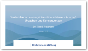Nach der Begrüßung der rund 60 Teilnehmer aus Politik, Wirtschaft und Wissenschaft durch unseren Vorstandsvorsitzenden Aart De Geus gab Thieß Petersen einen kurzen Überblick (siehe Präsentation unten) über Ausmaß, Ursachen und Folgen der deutschen Export- und Leistungsbilanzüberschüsse. Die anschließende Diskussion moderierte die Journalistin Astrid Frohloff. An ihr nahmen u. a. Anke Hassel (Direktorin des WSI Düsseldorf), Gabriel Felbermayr (ifo München), Stormy-Annika Mildner (BDI Berlin), Florian Moritz (DBG Berlin) und Henrik Müller (TU Dortmund) teil.