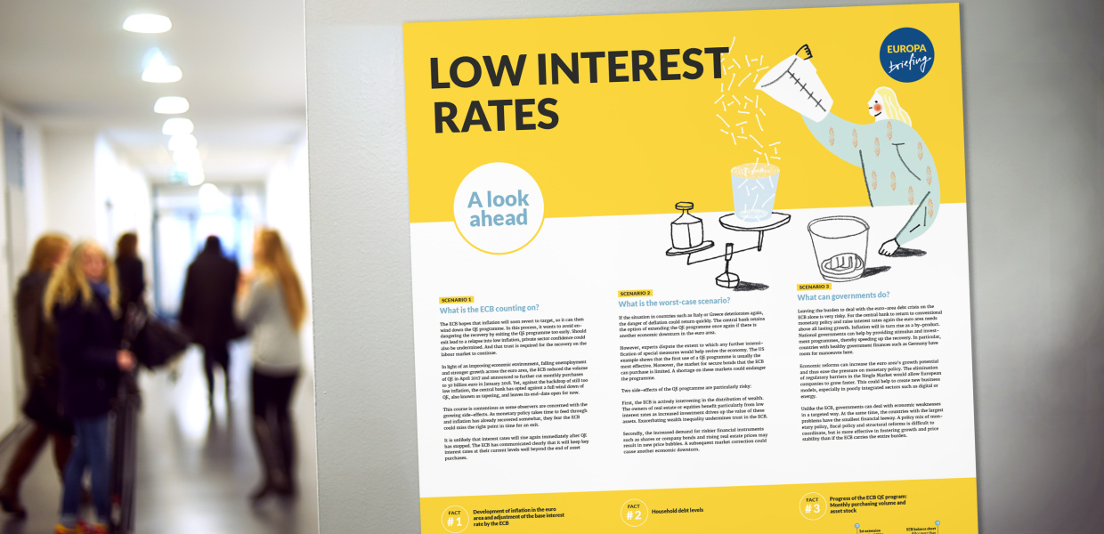 In our first "Europa Briefing", we explain when low interest rates become problematic and what the European Central Bank (ECB) is doing to increase inflation. We also look ahead and look at what can happen if inflation continues to remain as low as before. We also explain what governments in the euro area must now do to resolve the conflicts surrounding low-interest policy.