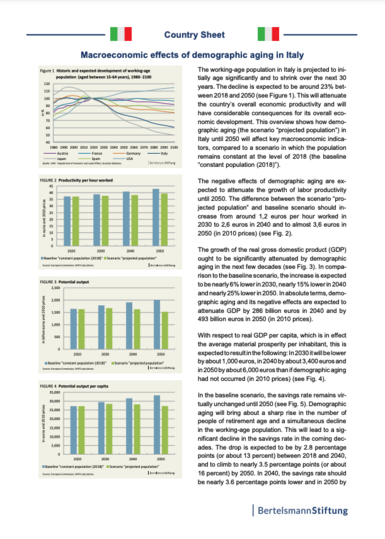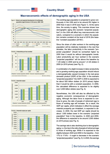 This country sheet summarises on two pages the expected consequences of demographic change for the development of labor productivity, gross domestic product (absolute and per capita), the macroeconomic savings and investment rate, the inflation rate and the current account...