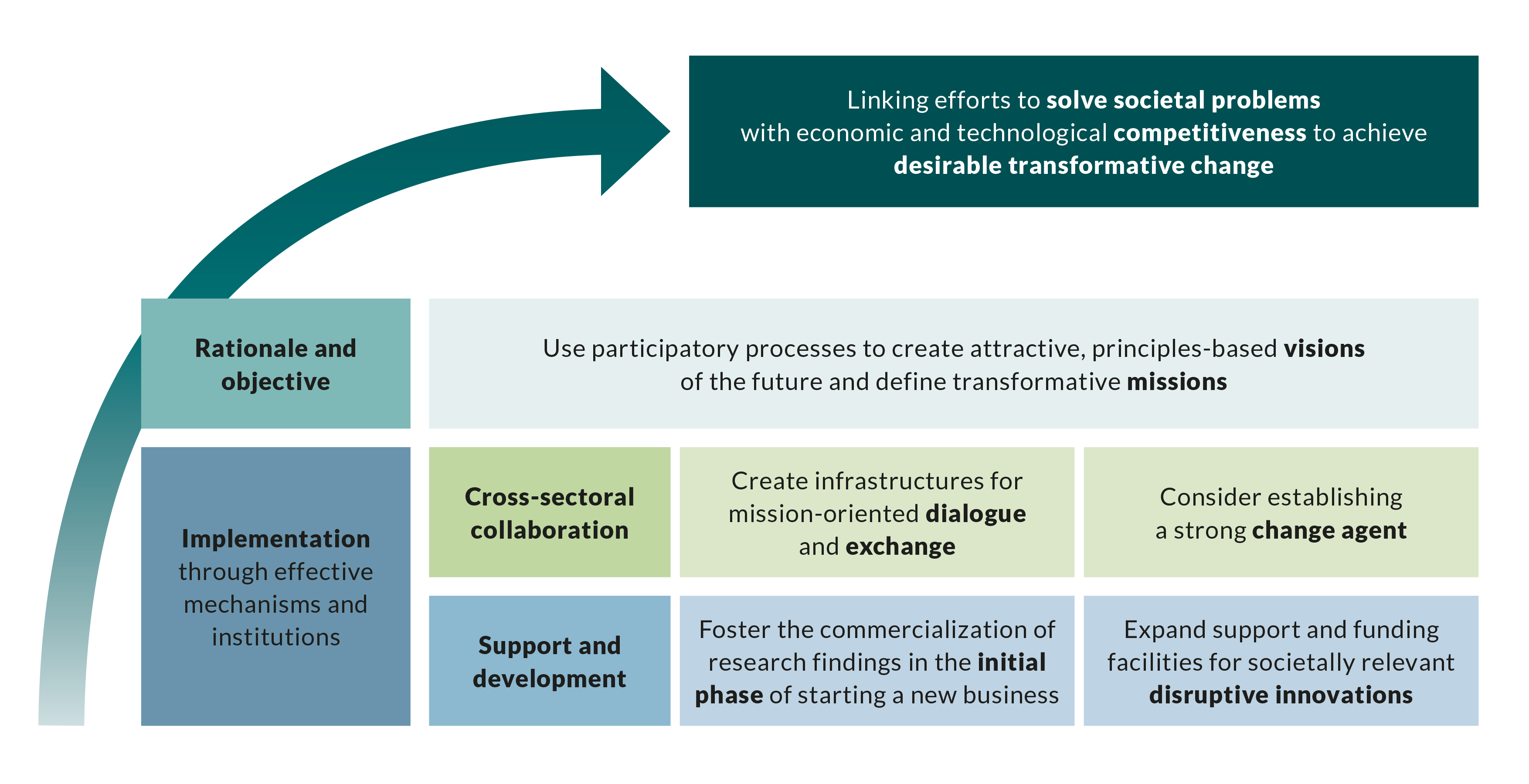 Innovation can deliver solutions to grand challenges in society while facilitating both economic and technological competitiveness – and thus contribute to transformative change. In order to achieve this goal, we need the right policies and mechanisms at work in our strategies, instruments, and institutions and organizations. Leveraging organizational synergies makes it possible to formulate visions with widespread appeal that can be implemented through appropriate mechanisms and institutions. Securing an inclusive consensus among actors across all segments of society on the direction and design of innovation activities is essential to the success of such a project.