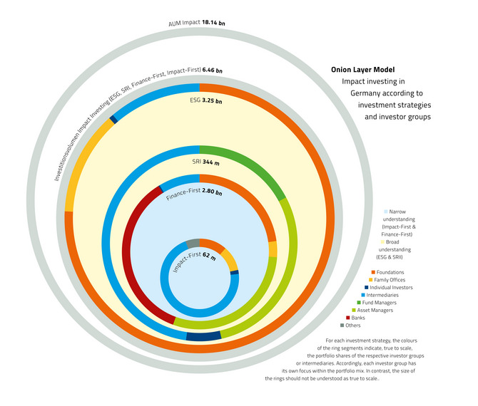 In a broad understanding of impact investing, which includes the two other approaches Socially Responsible Investments and ESG Investing, the market volume even totals € 6.5 billion. These investment strategies can also have a positive impact, but they focus on avoiding social, environmental and governance risks.
