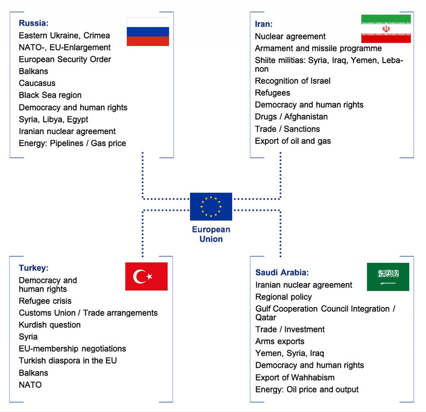 It goes without saying that the Neighbourhood Policy focusses first and foremost on the interests of the EU’s neighbouring states. At the same time, it is important to properly understand the interests of the neighbours on the other side of the neighbouring region – and to be able to assess how they are impacting political and social developments in the neighbouring countries. The same is true for the interdependencies between the EU and the key states, and among the key states themselves.