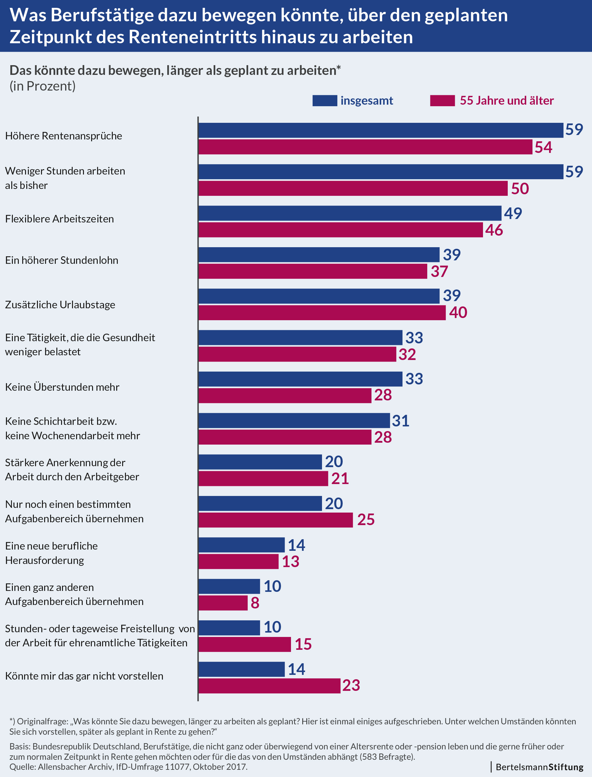 Die Experten der Stiftung erkennen in der Umfrage aber auch eine wachsende Bereitschaft der Bevölkerung, sich mit längeren Lebensarbeitszeiten anzufreunden. Während zur Jahrtausendwende noch mehr als die Hälfte der berufstätigen Befragten (2002: 52 Prozent) früher als gesetzlich vorgesehen in den Ruhestand gehen wollte, hat sich ihr Anteil auf aktuell 25 Prozent mehr als halbiert. Dagegen hat sich die Anzahl der Berufstätigen, die über die Ruhestandsgrenze hinaus arbeiten wollen, im selben Zeitraum verdoppelt (2002: 5 Prozent, 2017: 12 Prozent). "Die Mehrheit der Befragten kann sich noch nicht mit einer Heraufsetzung des gesetzlichen Renteneintrittsalters anfreunden, aber ein Trend zur Akzeptanz eines längeren Berufslebens ist deutlich erkennbar", erklärt André Schleiter. Dabei sind die Beweggründe für eine längere Erwerbstätigkeit von der sozioökonomischen Situation der Befragten abhängig: Je höher Qualifikationsniveau und Haushaltseinkommen, desto eher spielen Motive wie "Freude an der Arbeit" und „Kontakt mit Menschen“ eine Rolle. Je niedriger Einkommen und Qualifikationsniveau, desto eher sehen die Befragten längeres Arbeiten als finanzielle Notwendigkeit und weniger als sinnstiftende Chance.