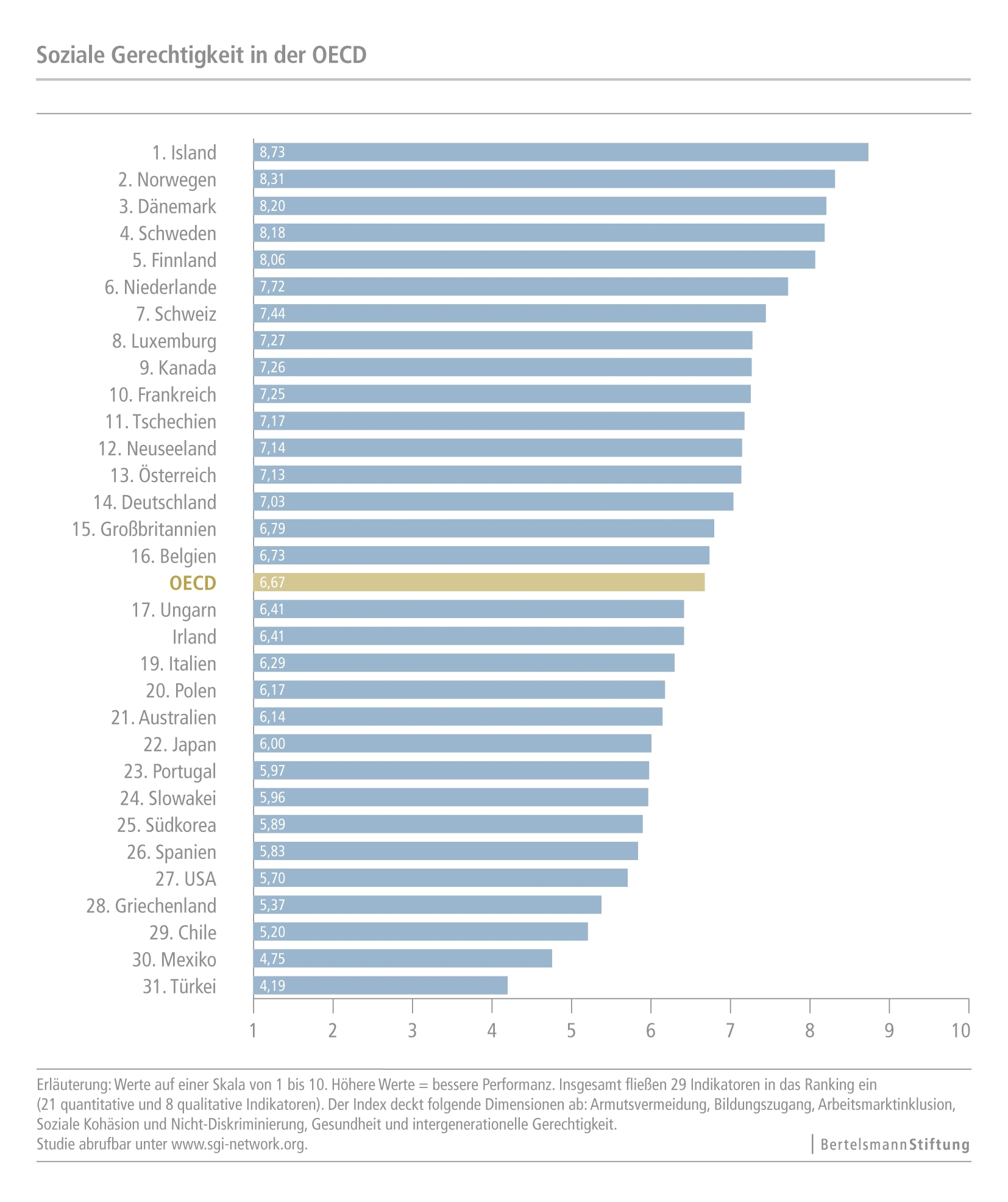 Aart De Geus, member of the Bertelsmann Stiftung Executive Board, said the study shows that "social justice and economic performance are by no means mutually exclusive. Northern European countries in particular demonstrate that the opposite is true." Iceland, Norway, Denmark, Sweden and Finland top the ranking.