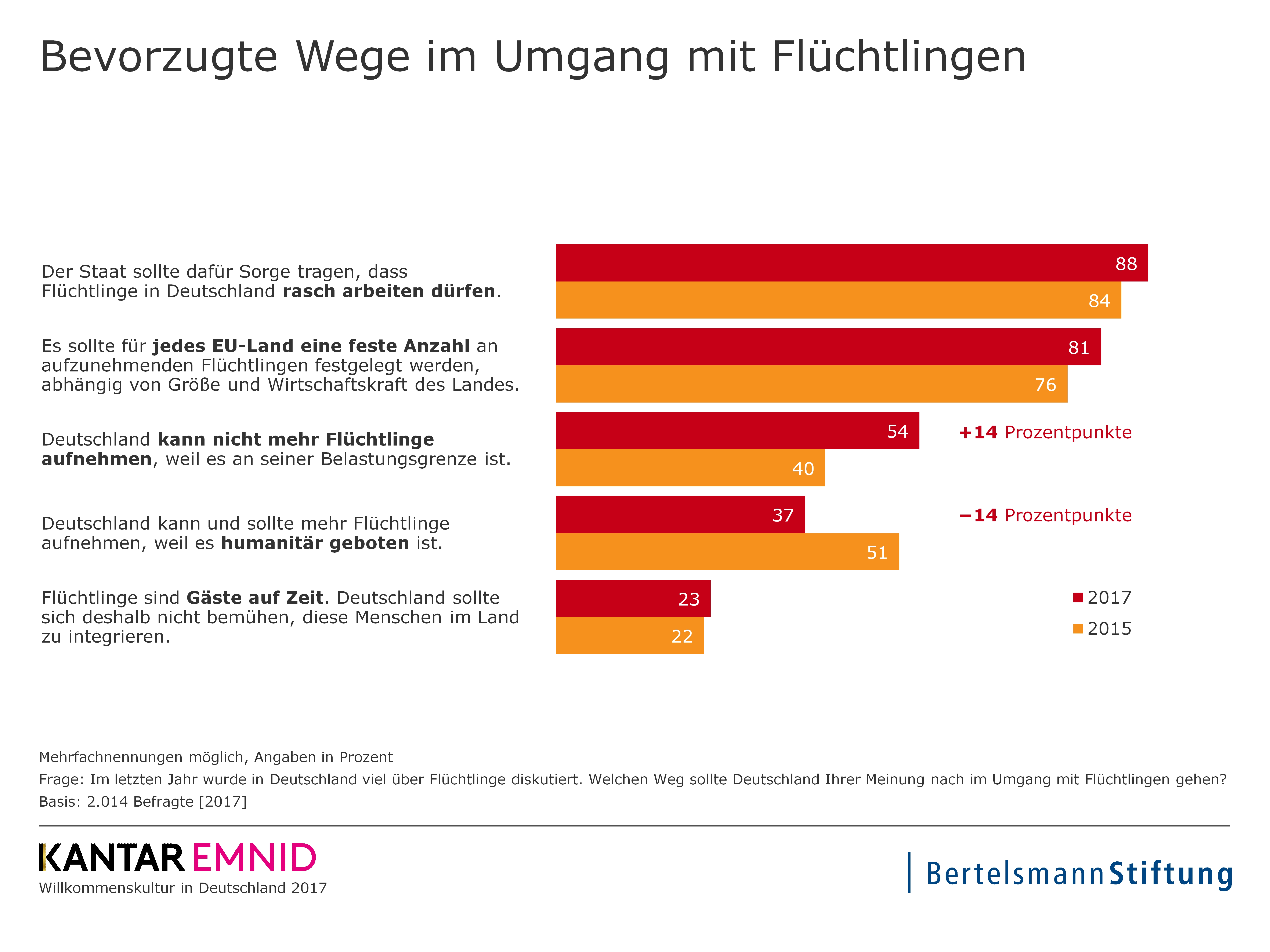 Für die Untersuchung "Willkommenskultur in Deutschland" befragte im Januar das Meinungsforschungsinstitut Kantar Emnid im Auftrag der Bertelsmann Stiftung 2.014 Menschen ab 14 Jahren, die in Deutschland wohnen. Vorläuferstudien wurden von Emnid im August 2011, Oktober 2012 und Januar 2015 durchgeführt, so dass Entwicklungen von Einstellungen abgebildet werden können.