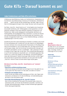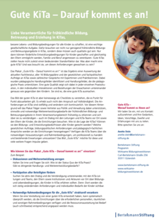 Das Plakat „Gute KiTa- darauf kommt es an!“ der Bertelsmann Stiftung liefert Impulse, um sich mit diesen wichtigen Fragen auseinanderzusetzen. Es ist das Ergebnis einer Auswertung der aktuellen nationalen und internationalen Fachliteratur, aller 16 Bildungspläne und der gesetzlichen und fachpolitischen Aufträge an KiTas sowie zahlreicher Gespräche mit Expertinnen und Praktikerinnen. Mit dem Plakat möchten wir einen offenen, kontinuierlichen Dialog zwischen Politik, Verwaltung, Trägern, KiTas und Eltern zur Qualität frühkindlicher Bildung und Betreuung anregen. Auf diese Weise werden alle Akteure gezielt für die Unterstützung notwendiger Reformbedarfe der Kitas vor Ort gewonnen. Die Verständigung über gemeinsame Vorstellungen von einer guten KiTa ist nicht zuletzt die Basis, um angemessene Ressourcenbedarfe zu benennen.