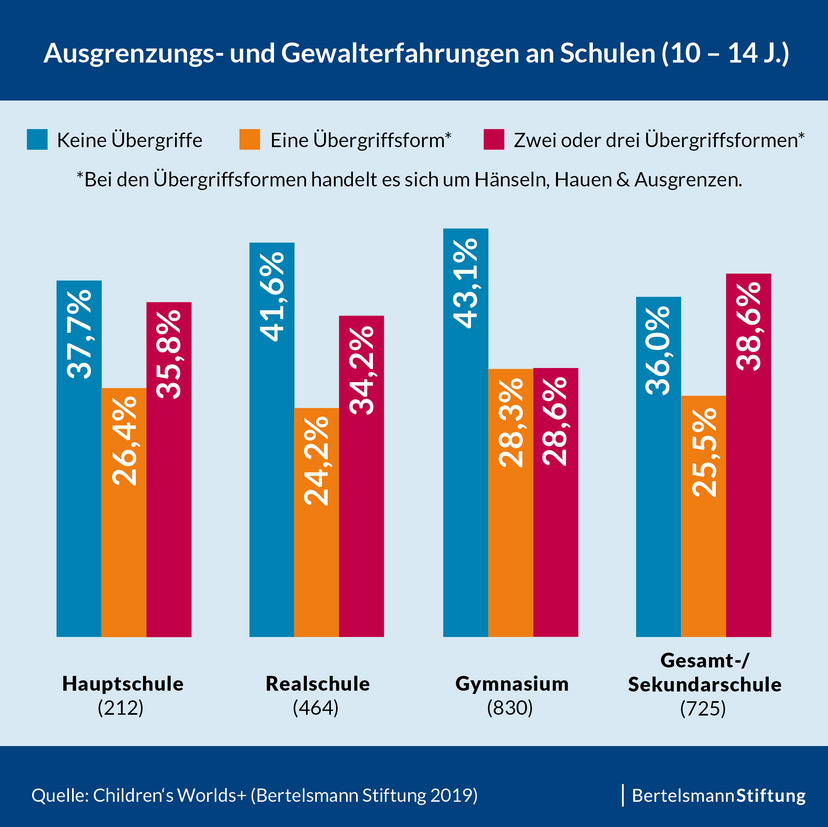 Besonders besorgt sind Kinder wegen Ausgrenzungs- und Gewalterfahrungen an Schulen. So beklagen viele Kinder an ihrer Schule im vergangenen Monat gehänselt, absichtlich gehauen oder ausgegrenzt worden zu sein. Je nach Schultyp unterscheiden sich die Erfahrungen: In Gesamt- und Sekundarschulen geben 39 Prozent der Befragten an, mindestens zwei der genannten Übergriffsformen (Hänseln, Hauen, Ausgrenzen) erlebt zu haben, rund 35 Prozent an Haupt- und Realschulen sowie 29 Prozent an Gymnasien. Für Jörg Dräger, Vorstand unserer Stiftung, sind die Zahlen erschreckend: