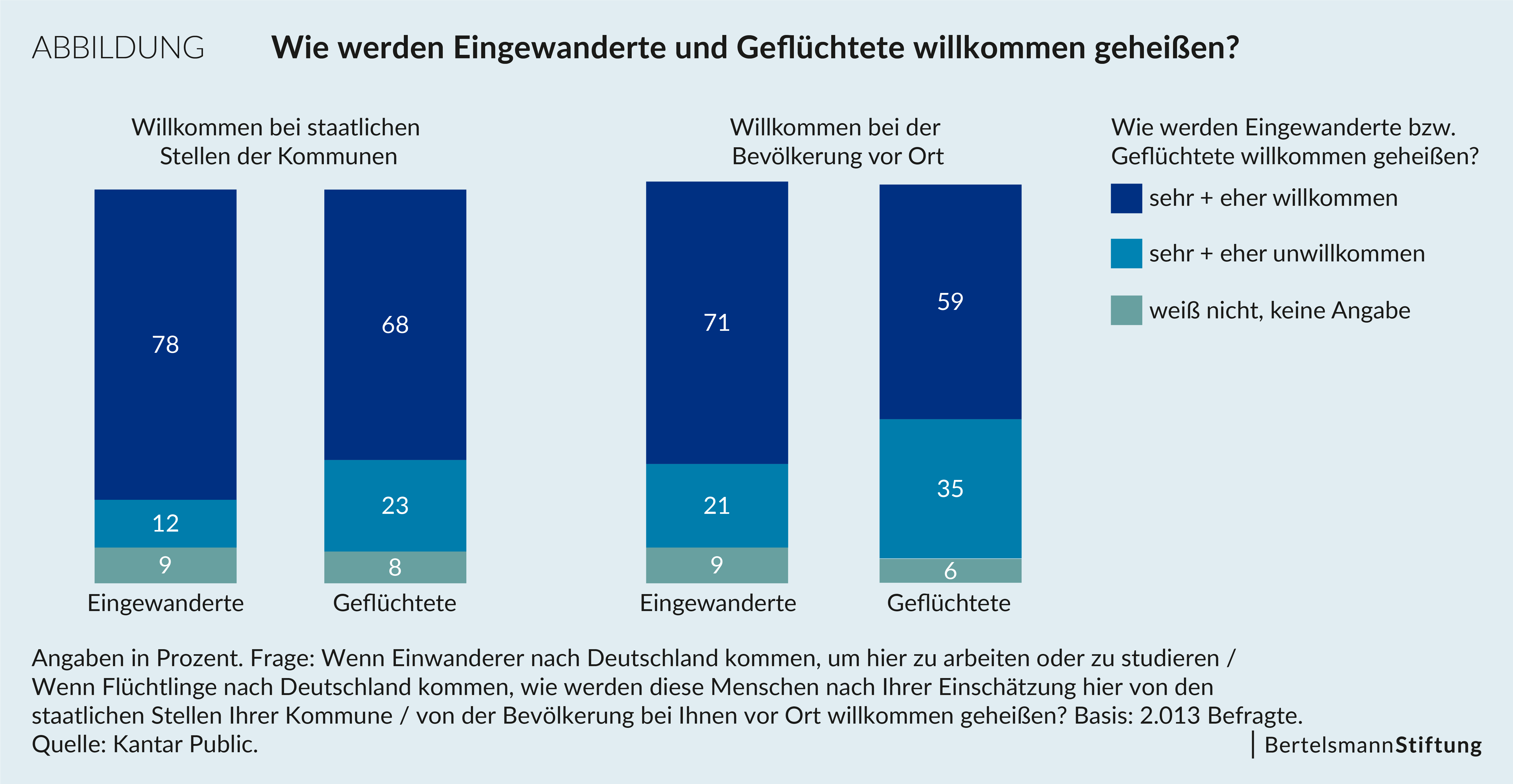 Die Werte fallen höher aus als bei den vorhergehenden Befragungen in den Jahren 2017 und 2019. Analog dazu sind die Sorgen vor möglichen negativen Effekten von Zuwanderung weiter zurückgegangen, auch wenn diese nach wie vor von einer Mehrheit geteilt werden. Befürchtungen im Hinblick auf Belastungen für den Sozialstaat äußern 67 Prozent der Befragten, 2019 waren es noch 71 Prozent. Konflikte zwischen Eingewanderten und Einheimischen erwarten noch 66 Prozent (2019: 69 Prozent). Mit Problemen in Schulen rechnen nur noch 56 Prozent (2019: 64 Prozent). Ungebrochen ist die Sorge vor Wohnungsnot in Ballungsräumen, die mit 59 Prozent auf demselben Niveau liegt wie vor drei Jahren.