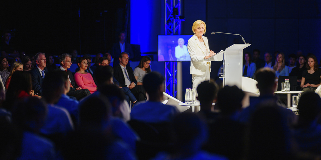 "Sie sind die Säulen der Zukunft", rief Liz Mohn den Jugendlichen in ihrer Begrüßung zu. Dem von ihr gegründeten Liz Mohn Center, aber auch ihr selbst, sei es wichtig, den Jugendlichen eine Stimme zu geben. "Wir leben in einer zerrissenen Welt", erinnerte sie. "Die jungen Menschen haben Ängste, die wir ernst nehmen müssen."