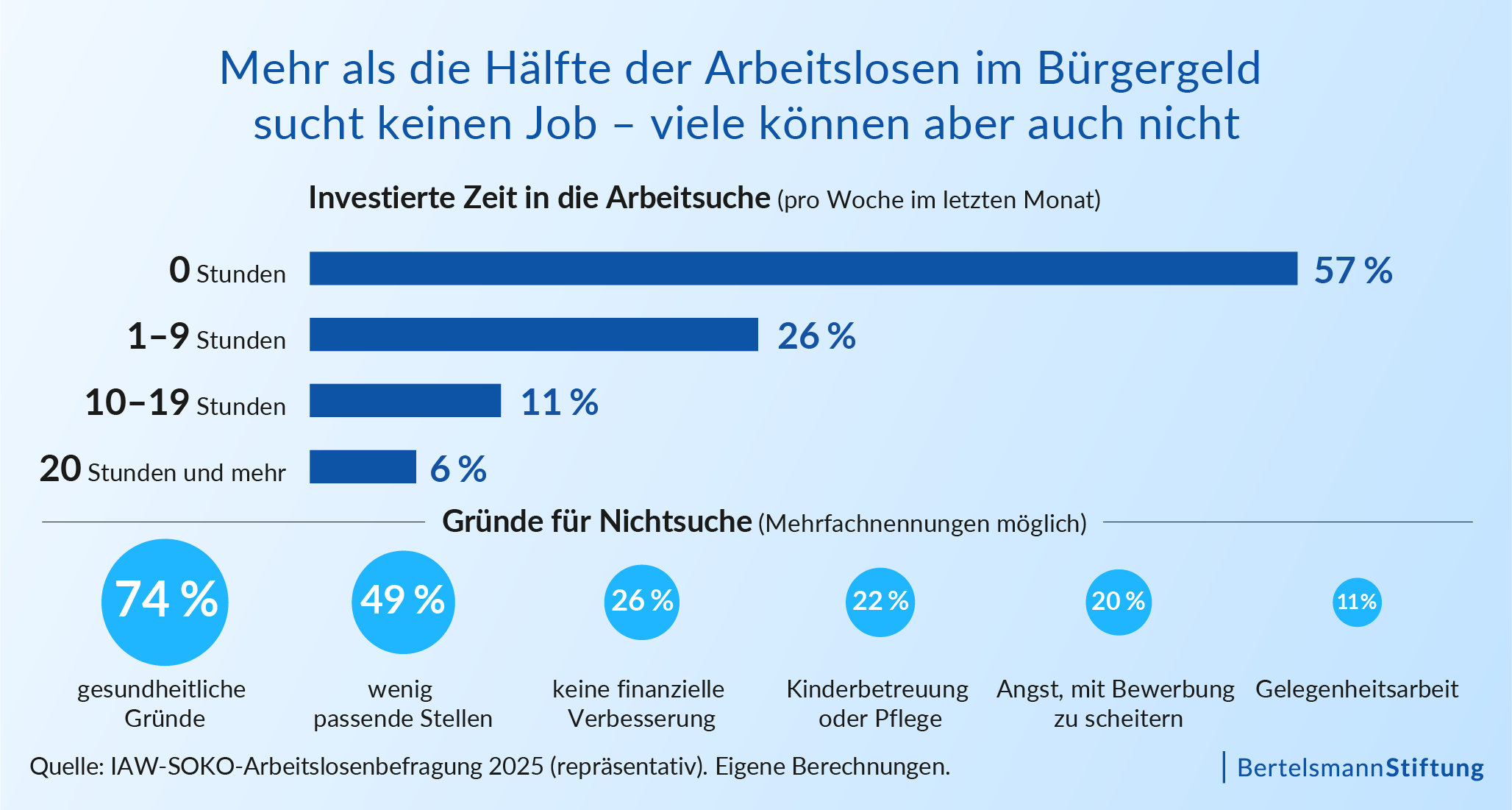Rund 1,8 Millionen Menschen in Deutschland sind laut Statistik arbeitslos und beziehen Bürgergeld, gelten also grundsätzlich als erwerbsfähig. Keine verlässlichen Informationen gab es dagegen bisher darüber, ob und wie intensiv die Betroffenen auf Jobsuche sind und wie gut die Jobcenter sie unterstützen. Eine Befragung des Instituts für Angewandte Wirtschaftsforschung (IAW) im Auftrag unserer Stiftung zeigt: 57 Prozent der Befragten geben an, sie hätten in den zurückliegenden vier Wochen gar nicht nach einem Job gesucht, davon 53 Prozent der Männer und 63 Prozent der Frauen. Selbst unter den aktiv Suchenden investiert der Großteil vergleichsweise wenig Zeit in die Jobrecherche: Nur 26 Prozent der Befragten suchen bis zu neun Stunden pro Woche. Sechs Prozent investieren 20 Stunden oder mehr in die Suche.