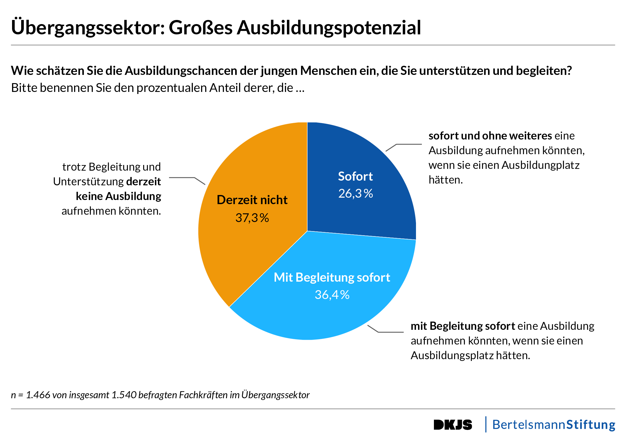 Fast 70.000 Ausbildungsplätze blieben in Deutschland im Jahr 2024 unbesetzt. Zugleich beginnen jedes Jahr fast 250.000 Jugendliche eine Maßnahme im sogenannten Übergangssektor, weil sie nach der Schule keinen Ausbildungsplatz finden oder weil ihnen wichtige Kompetenzen fehlen. Im Übergangssektor sollen Schulabgänger:innen ohne Ausbildungsplatz berufliche Grundkenntnisse erlangen. Bei den staatlich geförderten Maßnahmen handelt es sich zum Beispiel um Kurse zum Erwerb berufsbezogener Fähigkeiten mit Praktika in Betrieben oder das Nachholen von Schulabschlüssen. Knapp zwei Drittel der jungen Menschen im Übergangssektor bringen allerdings die Voraussetzungen mit, um sofort eine Ausbildung aufzunehmen, ein Teil davon mit Begleitung. So lautet die Einschätzung von Fachkräften, die Jugendliche beim Übergang von der Schule in den Beruf unterstützen. Dabei handelt es sich etwa um Mitarbeitende in Jobcentern, Berufsschulen, Bildungsträgern oder Einrichtungen der Jugendhilfe. An der von der Bertelsmann Stiftung und der Deutschen Kinder- und Jugendstiftung erstmals beauftragten Befragung beteiligten sich 1.540 Fachkräfte bundesweit.