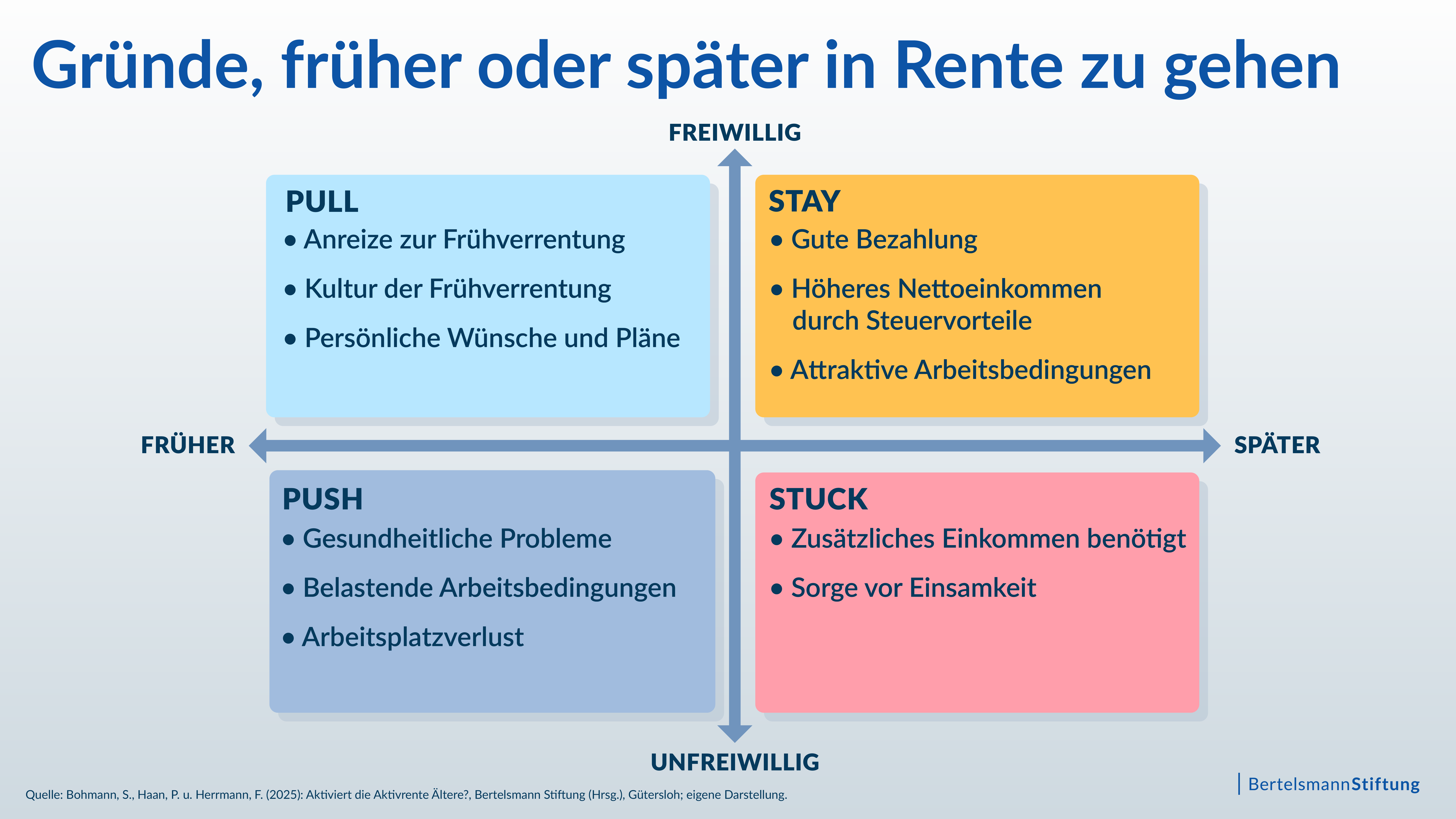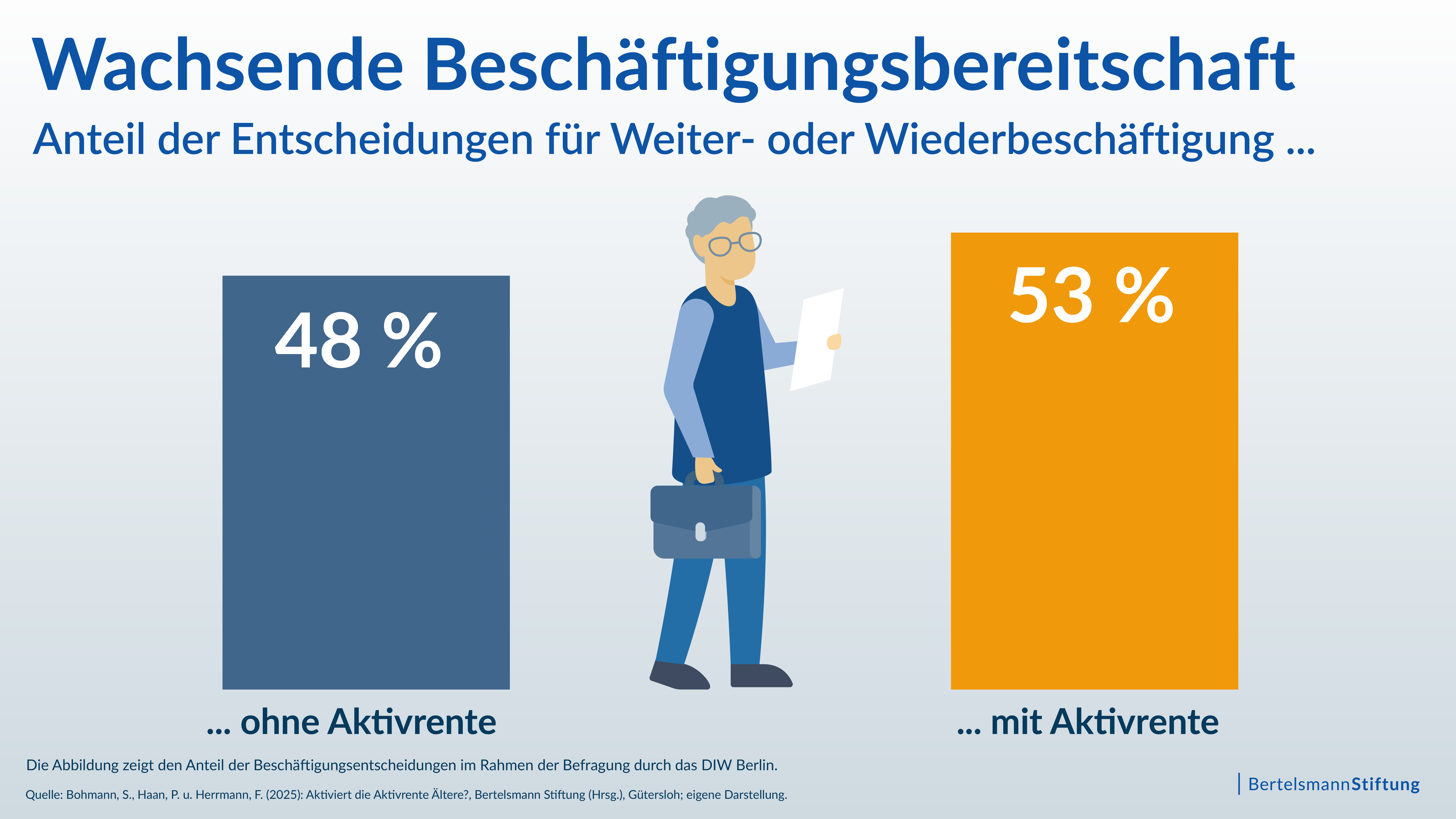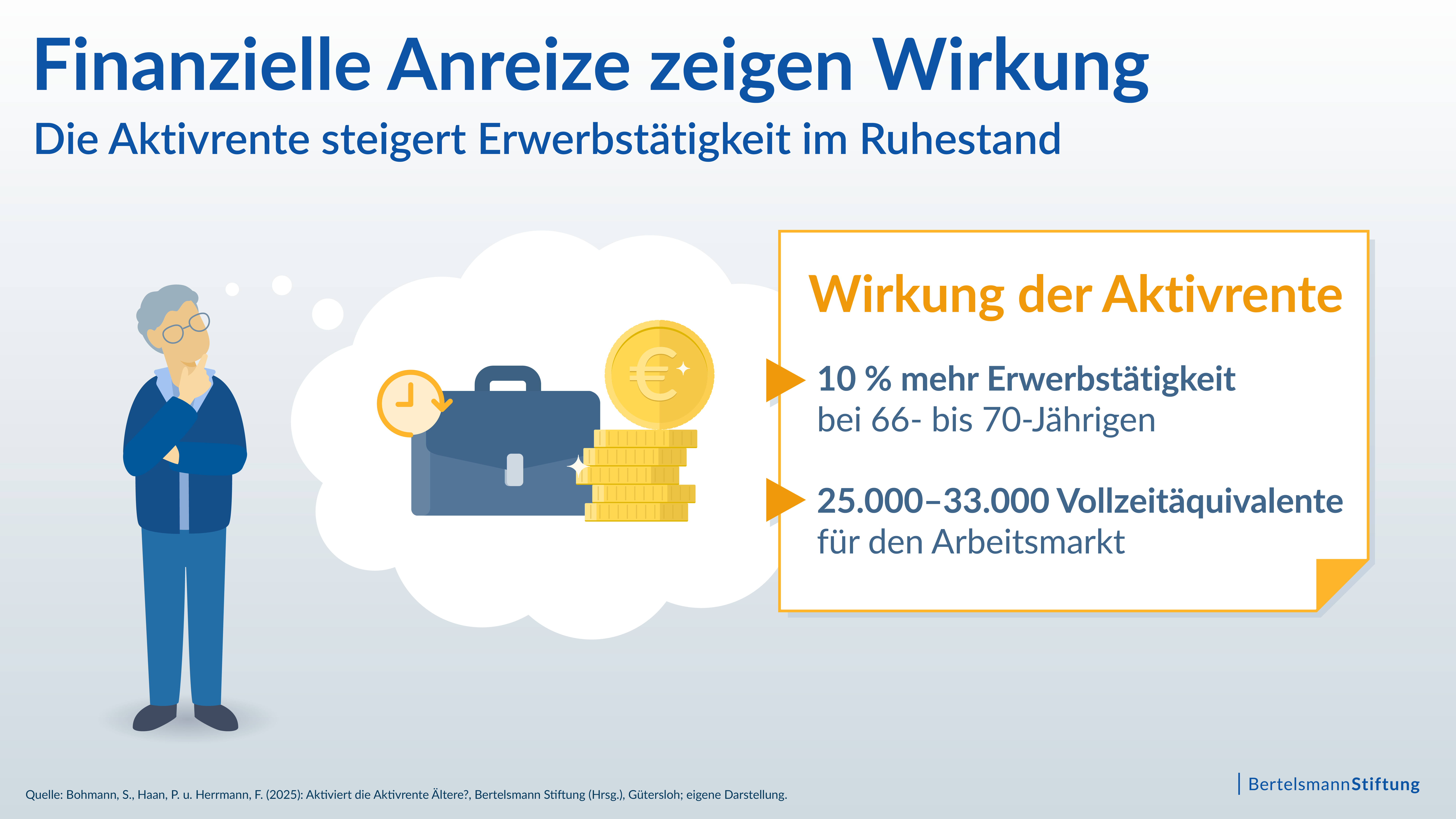 Zurzeit sind in Deutschland 21 Prozent der 65- bis 69-Jährigen erwerbstätig. Im Vergleich zu Dänemark oder Schweden ist die Quote damit eher gering – dort liegt sie bei rund 30 Prozent. Ältere Arbeitnehmer:innen verfügen über wertvolle Erfahrung, von der Unternehmen länger profitieren können, wenn mehr Menschen jenseits des gesetzlichen Rentenalters beruflich aktiv bleiben. "Die finanziellen Anreize der Aktivrente können das Weiterarbeiten auch dort attraktiver machen, wo Arbeitsbedingungen weniger günstig sind, etwa bei hoher Belastung, niedrigem Stundenlohn oder fehlender Möglichkeit zum Homeoffice. Die Aktivrente könnte somit einen Beitrag zur Linderung des Fachkräftemangels auch in weniger attraktiven Engpassberufen leisten", sagt unser Arbeitsmarktexperte André Schleiter.