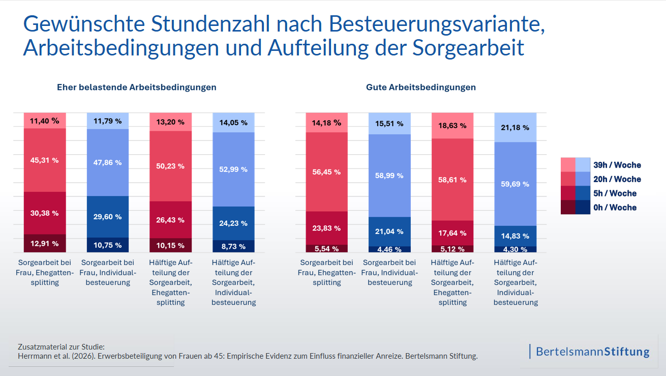 Darüber hinaus zeigten sich zwei Verstärker-Effekte, die eine Beschäftigung mit höherer Stundenzahl noch attraktiver machten: die gleichmäßige Aufteilung der Sorgearbeit und bessere Arbeitsbedingungen. Wird die Sorgearbeit zwischen den Partner:innen gleichmäßig aufgeteilt, steigen die durchschnittlichen Wochenarbeitsstunden signifikant an – bereits im aktuellen Steuersystem, und noch ausgeprägter unter einer Individualbesteuerung, also einer getrennten Veranlagung zur Einkommensteuer. Zudem zeigt die Erhebung, dass die Kombination aus Individualbesteuerung und geteilter Sorgearbeit zu höheren Zustimmungswerten (knapp 18 Prozent) für eine Vollzeiterwerbstätigkeit von 39 Stunden führt. Einen ähnlichen Effekt haben Arbeitsbedingungen, die mit geringer Belastung einhergehen. Sind diese gegeben, liegt auch hier der Anteil der Befragten, der sich einen Erwerbsumfang von 39 Wochenstunden wünscht, bei etwa 18 Prozent. Bei belastenden Arbeitsbedingungen und einseitiger Sorgearbeitsaufteilung sinkt der Anteil dagegen auf knapp 13 Prozent in beiden Szenarien.