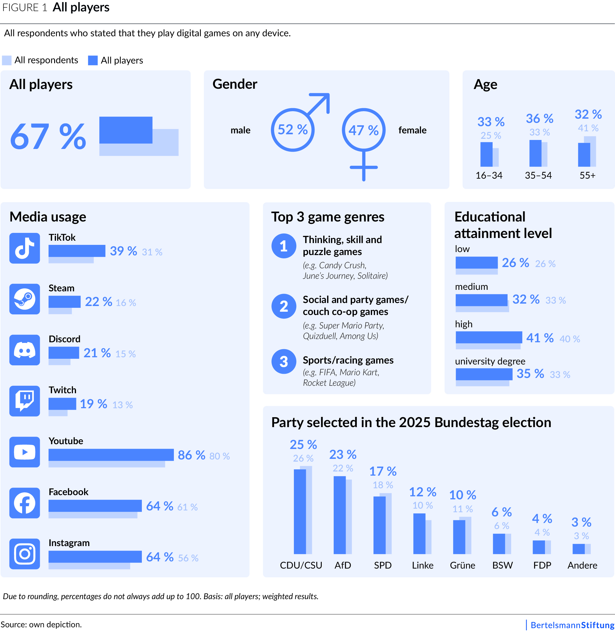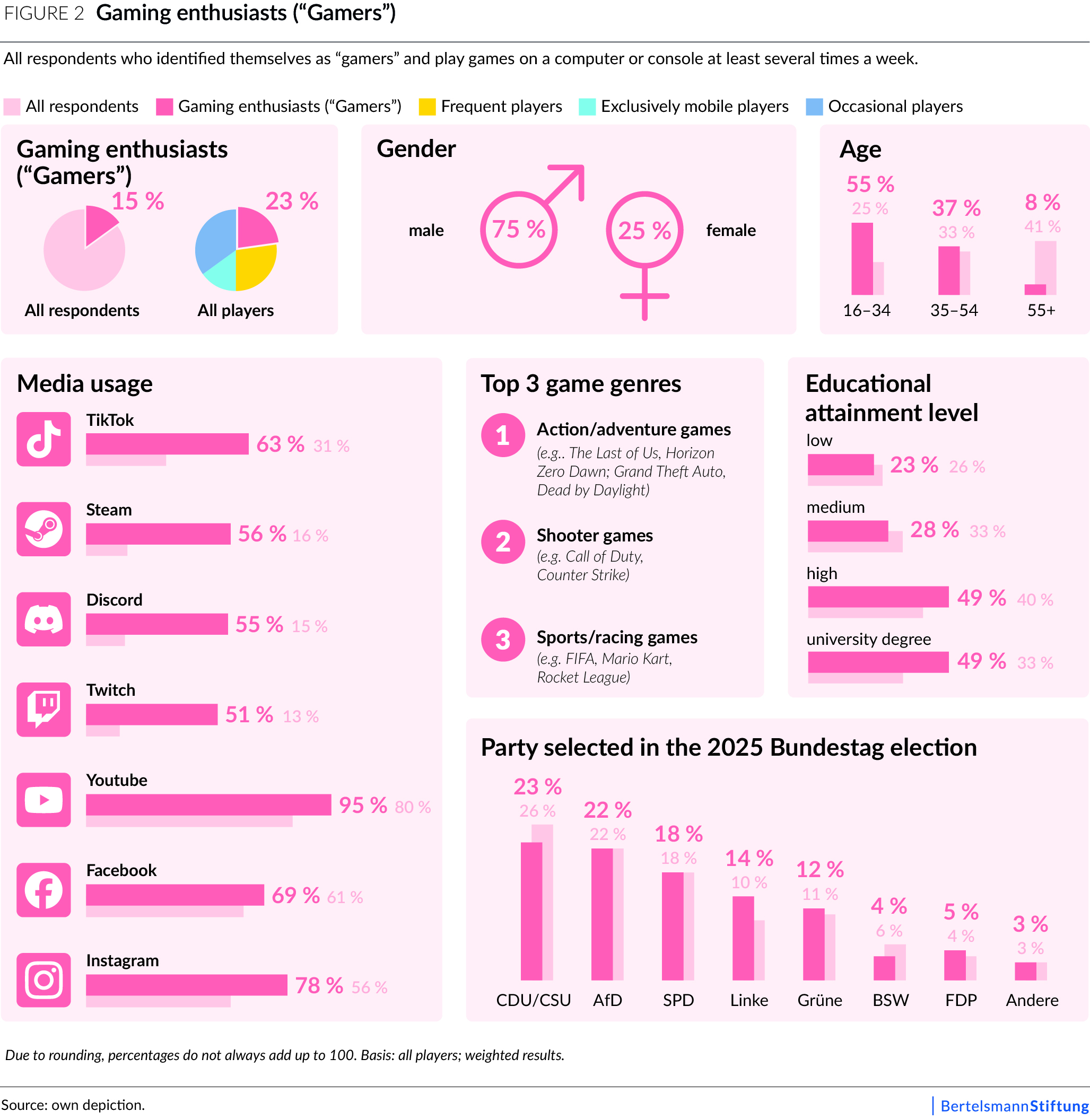 The study data was collected by pollytix strategic research gmbh on behalf of the Bertelsmann Stiftung’s "Democracy and Social Cohesion," "Education and the Next Generation," and “Digitalization and the Common Good” programs. The survey was conducted as a quota sampling via an online panel. A total of 6,435 internet users aged 16 and above were surveyed in the period from March 10 to 25, 2025. The group of “gaming enthusiasts” comprised 1,203 respondents.